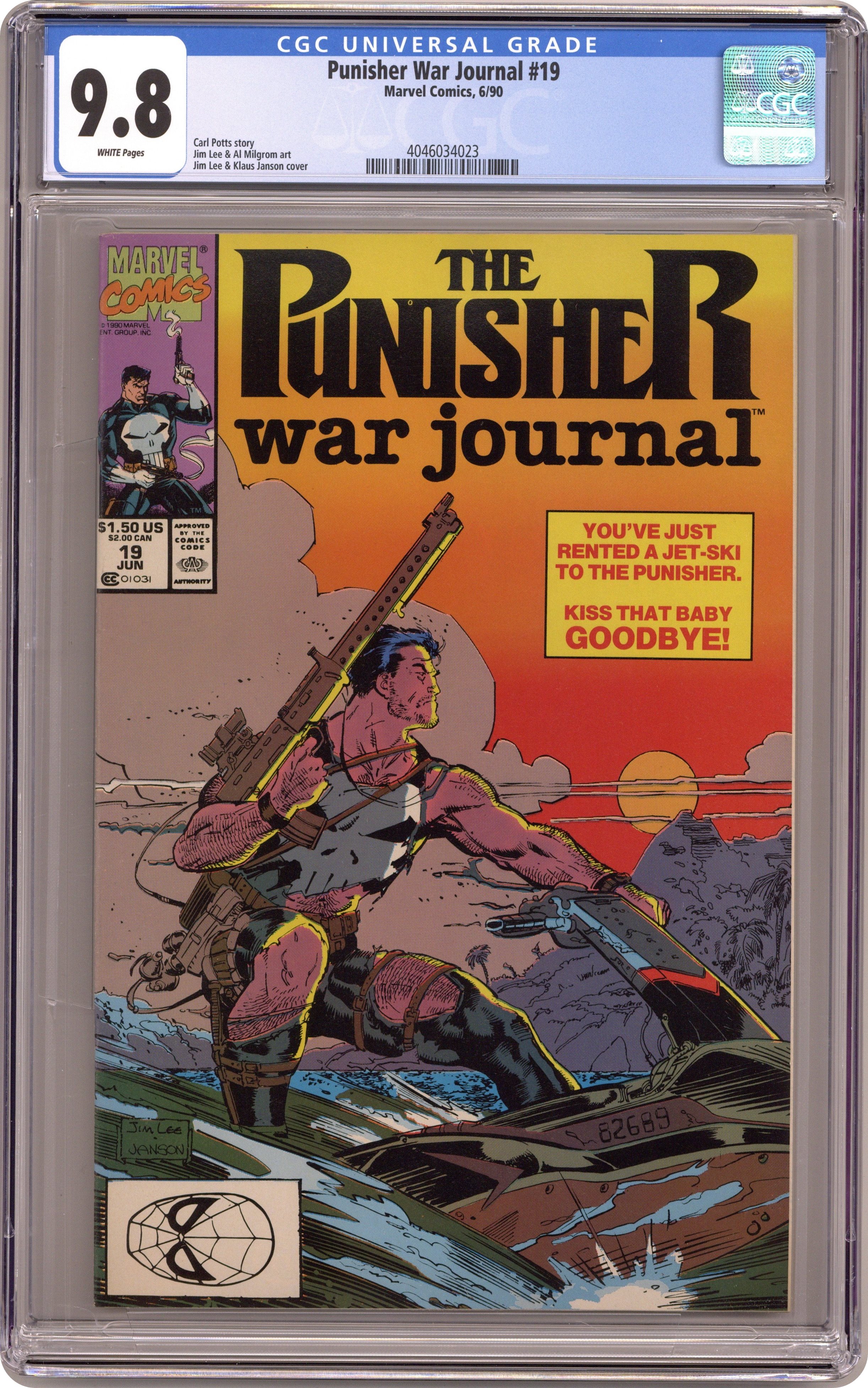 Cover art by Jim Lee and Klaus Janson. Trauma in Paradise, script by Carl Potts, pencils by Jim Lee, inks by Al Milgrom and Don Hudson; Punisher and Microchip face off against drug dealers in Hawaii, bringing that story arc to a close. 36 pgs. $1.50. Cover price $1.50. Grade: CGC 9.8 explanation of grade Condition: Used (collectible)