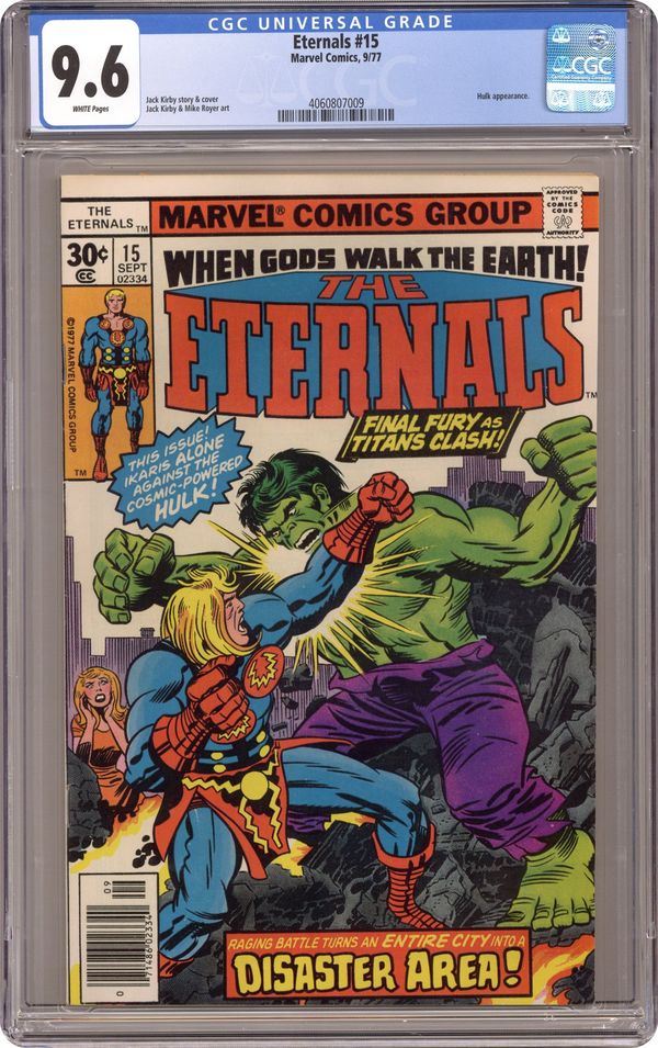 "Disaster Area." Written by Jack Kirby. Pencils by Jack Kirby. Inks by Mike Royer. The battle between Ikaris and the cosmic-powered Hulk continues! But as these two immensely powerful warriors threatens to topple the city around them. Can even Ikaris contain the fury of the Cosmic Hulk?! Cover price $0.30. Grade: CGC 9.6 explanation of grade Condition: Used (collectible)