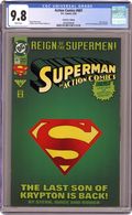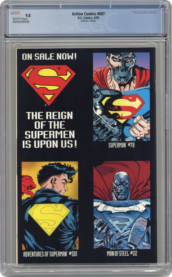 Die-cut cover by Jackson Guice; 687N cover by Kerry Gammill and Jackson Guice. Beginning the 'Reign of the Supermen,' continued from Adventures of Superman (1939) #500. The Last Son of Krypton returns to action, and this Superman has no qualms about taking a human life...so long as it's the right thing to do! Also, Pa Kent reacts to Superman's tougher techniques. Bound into the center of this issue is a double-page miniposter of Superman, printed on cover stock. Written by Roger Stern, with art by Jackson Guice and Denis Rodier. 44 pages, Full Color, $1.95. Cover price $1.95. Grade: CGC 9.8 explanation of grade Condition: Used (collectible)