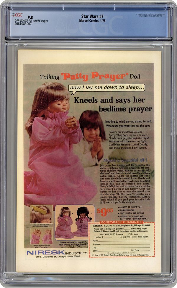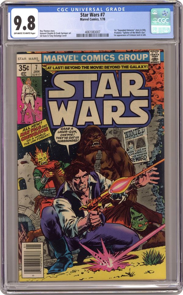 1st printing Newsstand Edition."New Planets, New Perils!" Written by Roy Thomas. Art by Howard Chaykin and Frank Springer. Following the destruction of the Death Star, Han Solo and Chewbacca embark on a deadly solo mission on a strange and dangerous world. Cover price $0.35. Grade: CGC 9.8 explanation of grade Condition: Used (collectible)