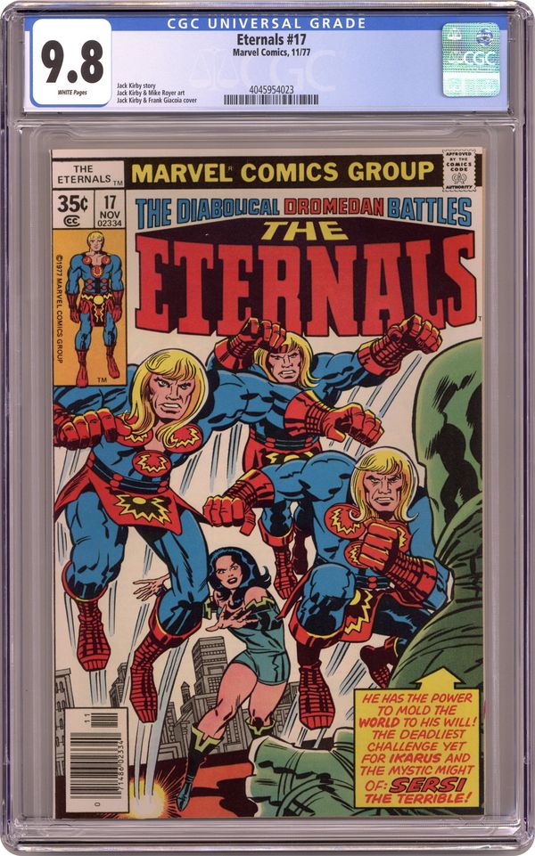 "Sersi the Terrible." Written by Jack Kirby. Pencils by Jack Kirby and Mike Royer. A dark power has risen and threatens to mold the world into his dark image. Even the immortal power of the Eternals may not be enough to stop him. Note: First appearance of Sigmar. Cover price $0.35. Grade: CGC 9.8 explanation of grade Condition: Used (collectible)