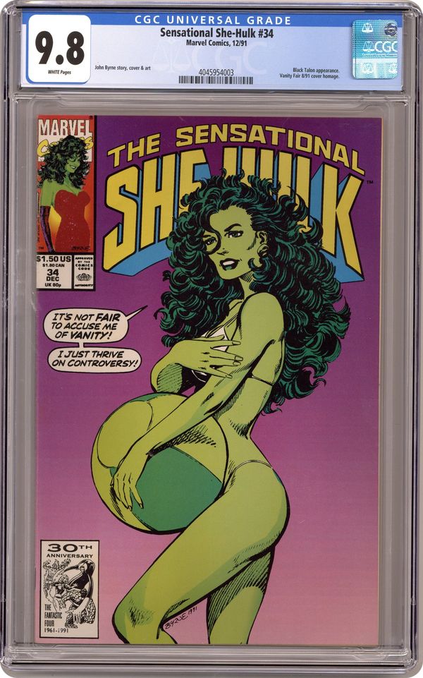Cover art by John Byrne. "Who Was That Zombie I Saw You With...?" starring She-Hulk, Weezi Mason, D.A. Tower, Black Talon II (Samuel D. Barone), The X-Humed (zombies), Scaleface, and Mahkizmo, script and pencils by John Byrne, inks by Keith Williams; She-Hulk and Weezi travel to New Orleans to meet with a Voodoo master they believe can help solve a case; She-Hulk battles Black Talon II. 36 pgs. Cover price $1.50. Grade: CGC 9.8 explanation of grade Condition: Used (collectible)