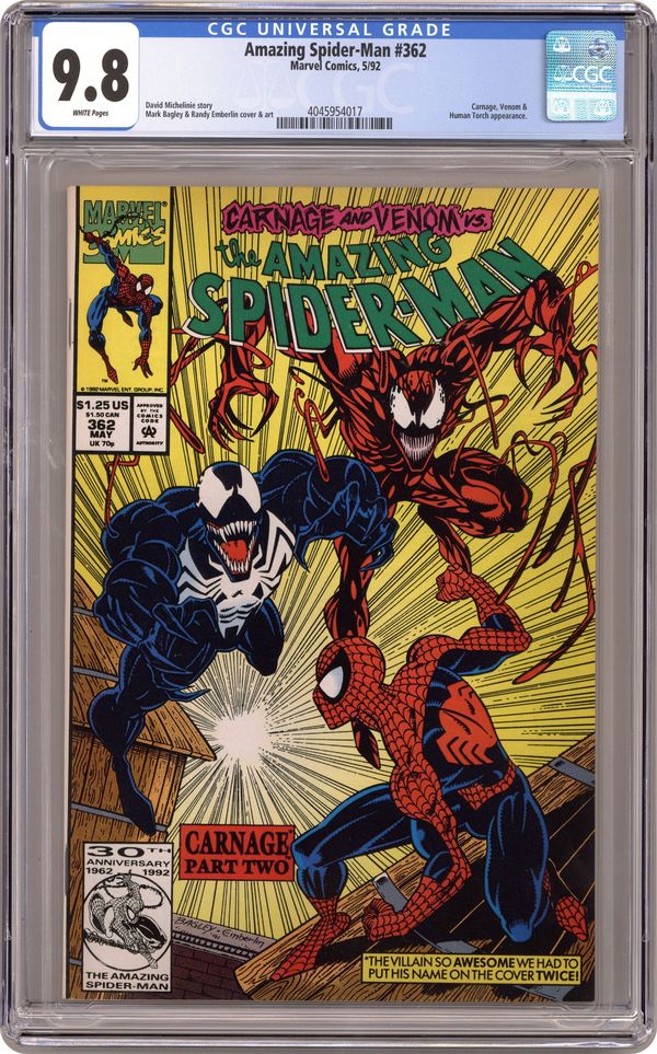 First Printing. Direct Edition. "Savage Alliance!" Part 2 of 3. Guest-starring the Human Torch. Script by David Michelinie. Pencils by Mark Bagley. Inks by Randy Emberlin. Cover by Mark Bagley and Randy Emberlin. After getting a taste of Carnage's raw power last issue, the wall-crawler knows he needs serious help! To that end the amazing one does the unthinkable! He pays a visit to Venom! Wow, is that a good idea? However as a precaution the web-slinger brings Johnny Storm along for the ride to Venom's deserted island! And following an intense battle, Venom surprisingly agrees to help his good pal Spidey! So in a truly unlikely pairing, the Spectacular Spider-Man and the Lethal Protector join forces to take down Carnage! You have to see it to believe it! Cameo appearance by J. Jonah Jameson. (Note: The issue includes a full-page ad for the Toxic Crusaders (1992) series with art by Sam Kieth.) 36 pages. $1.25 cover price. Cover price $1.25. Grade: CGC 9.8 explanation of grade Condition: Used (collectible)