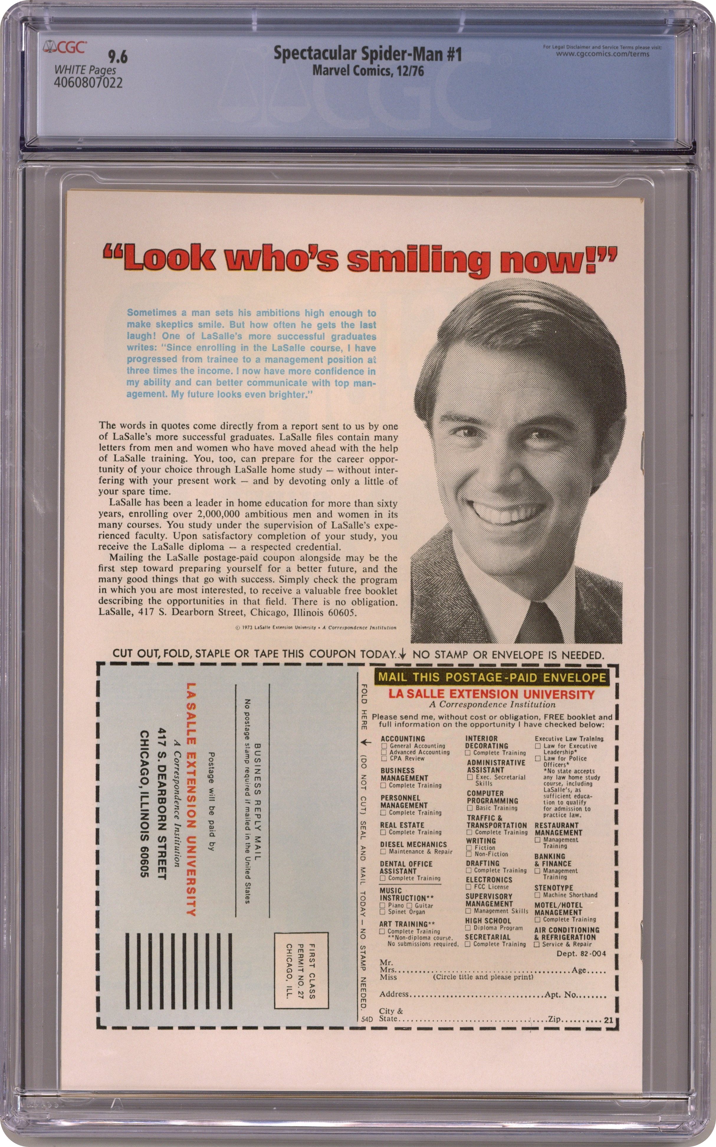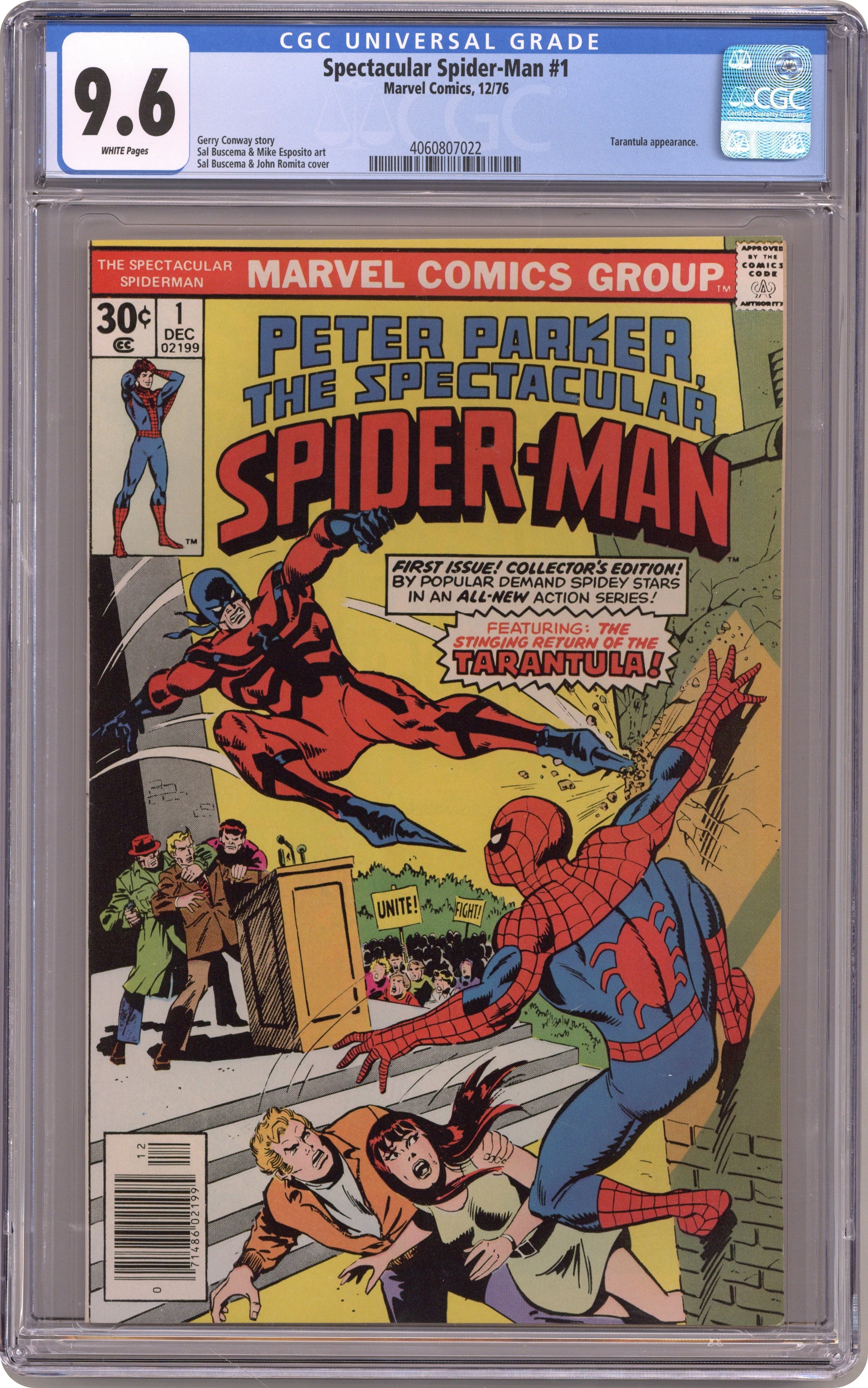 "Twice Stings The Tarantula!" Part 1 of 3. Script by Gerry Conway. Pencils by Sal Buscema. Inks by Mike Esposito. Cover by Sal Buscema and John Romita. The first issue of a brand new series for Spider-Man! The story opens with a bang as the Tarantula kidnaps the Empire State University vice-chancellor, despite the best efforts of the web-slinger, Flash Thompson, and Mary Jane Watson! Next, the Tarantula tries to kill the mayor, but this time the Spectacular Spider-Man is ready! Can the wall-crawler beat the Tarantula and save Mayor Abe Beame? First appearance of Edward Lansky (aka Lightmaster). (Notes: The Spectacular Spider-Man series became the third monthly title for Spider-Man. The first issue of the series debuted the same month as Amazing Spider-Man 163 and Marvel Team-Up 52. The letters page contains an essay from Gerry Conway describing the plans for the new Spider-Man title.) 32 pages Cover price $0.30. Grade: CGC 9.6 explanation of grade Condition: Used (collectible)