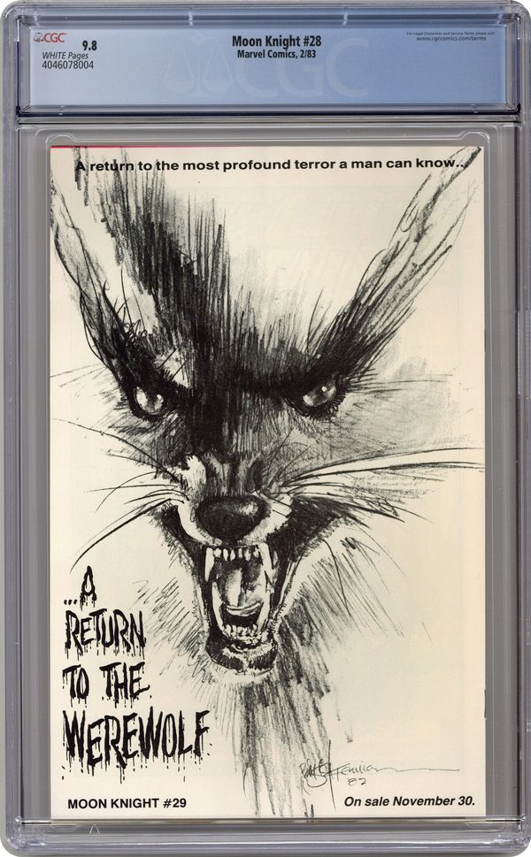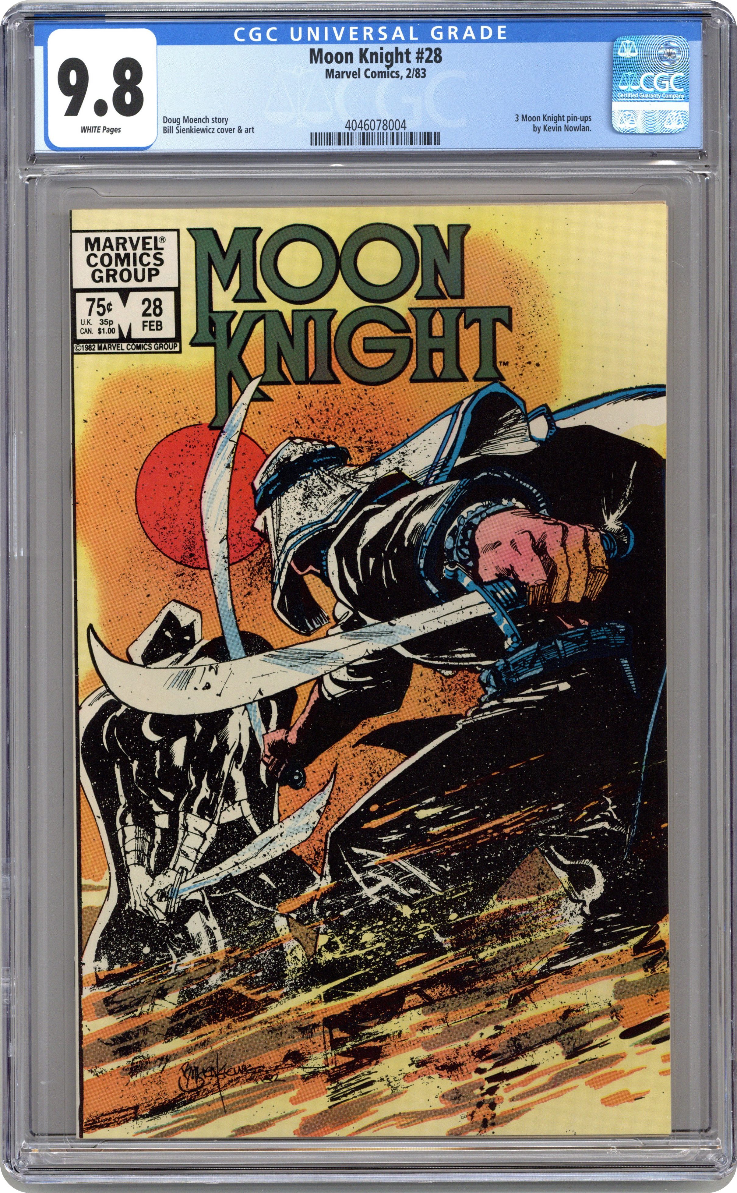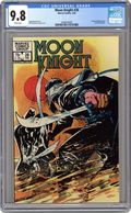 "Spirits in the Sand!" Written by Doug Moench. Art and cover by Bill Sienkiewicz. Marlene and Moon Knight travel back to the Sudan and end up protecting an uncovered treasure of Khonshu from grave robbers in the same temple where Moon Knight was born. Includes a Moon Knight Portfolio by Kevin Nowlan. Cover price $0.75. Grade: CGC 9.8 explanation of grade Condition: Used (collectible)