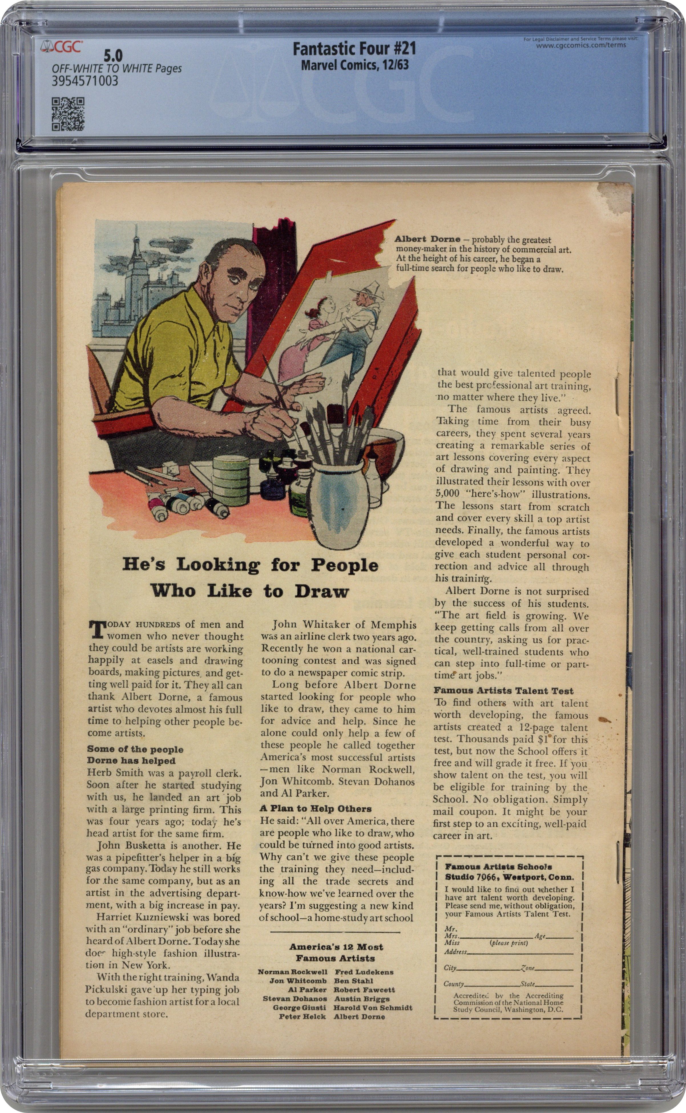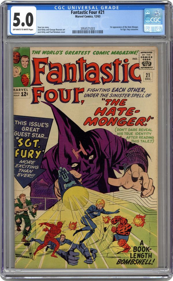 Cover pencils by Jack Kirby, inks by Paul Reinman. First appearance of the Hate-Monger in "The Hate-Monger!", script by Stan Lee, pencils by Jack Kirby, inks by George Roussos [as George Bell]; Nick Fury, now a colonel in the CIA, enlist the aid or the Fantastic Four against the Hate-Monger even though they are under the control of his Hate-Ray. First Sgt. Fury cross-over. Spider-Man cameo. 36 pgs. $0.12. Cover price $0.12. Grade: CGC 5.0 explanation of grade Condition: Used (collectible)