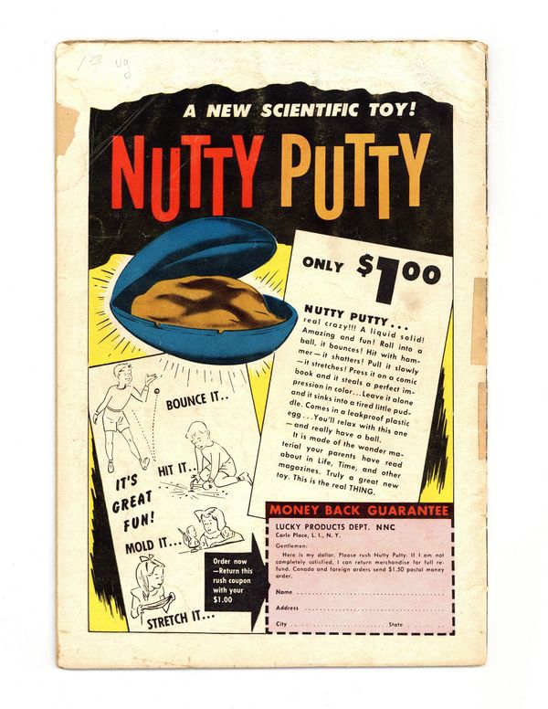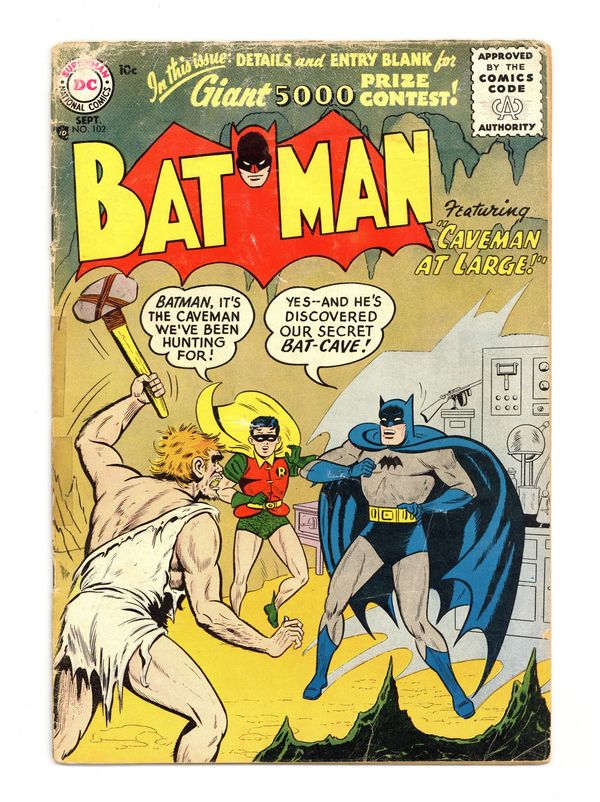 Cover by Sheldon Moldoff. "The House of Batman," pencils by Sheldon Moldoff, inks by Charles Paris; A wealthy man leaves money to Gotham to build a downtown HQ for Batman, but the Caped Crusader is surprised when the city builds as House of Batman for him. "The Batman from Babylon," script by Bill Finger, pencils by Dick Sprang, inks by Charles Paris; When Brand Bartor is arrested for dressing in a Batman costume, the crook turns the tables on the Caped Crusader by implying Batman should be arrested for impersonating a Babylonian Batman! "Scotland Yard's Search for a Stone" text story. Half-page Pretzels story by Phil Berube. "The Caveman at Large," script by Bill Finger, pencils by Sheldon Moldoff (as Bob Kane), inks by Charles Paris; A freak accident causes a great character actor to assume the character's persona he is dressed up to portray: a caveman! One-page Casey the Cop story by Henry Boltinoff. 36 Pages, Full Color. Cover price $0.10. Grade: FR 1.0 explanation of grade Condition: Used (collectible)