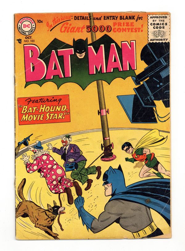Cover by Sheldon Moldoff. "The Broken Batman Trophies," script by Bill Finger, pencils by Dick Sprang, inks by Charles Paris; While making a TV appearance, Bruce accidently scraps his chin; Realizing that the mark may lead people to conclude Batman is Bruce Wayne, the Caped Crusader stages a series of blunders that seek to cover up this fact. How to Spend a Summer Week! public service announcement with Binky. Half-page Casey the Cop story by Henry Boltinoff. "The League of Ex-Convicts," script by Arnold Drake, pencils by Sheldon Moldoff, inks by Charles Paris; Batman smells a rat when several ex-cons are hired by various firms through the Stinson Employment Agency, then disappear along with loot from each of the the firms. 2/3-page Shorty story by Henry Boltinoff. Trouble Shooters in Uniform article by Jack Miller. "Bat-Hound Movie Star," script by Bill Finger, pencils by Sheldon Moldoff, inks by Charles Paris; Bat-Hound, having helped the Caped Crusaders track down criminal Baldy Gore, is the choice of a movie producer to be a star for an up-coming film about the crime-fighting pooch. 36 Pages, Full Color. Cover price $0.10. Grade: GD+ 2.5 explanation of grade Condition: Used (collectible)