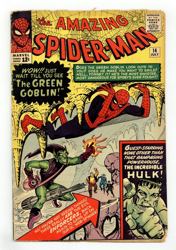 Cover art by Steve Ditko. First appearance of the Green Goblin (Norman Osborn) in The Grotesque Adventure of the Green Goblin!, script by Stan Lee, art by Steve Ditko; The Green Goblin hires the Enforcers to help him defeat Spider-Man; To further his plan he convinces B.J. Cosmos to film a movie of Spider-Man fighting Goblin and the Enforcers in the desert; While filming, Goblin and the Enforcers attack Spider-Man and accidentally awaken the Hulk. Reprinted in Marvel Tales # 9 and 152. 36 pgs. $0.12. Cover price $0.12. Grade: GD/VG 3.0 explanation of grade Condition: Used (collectible)