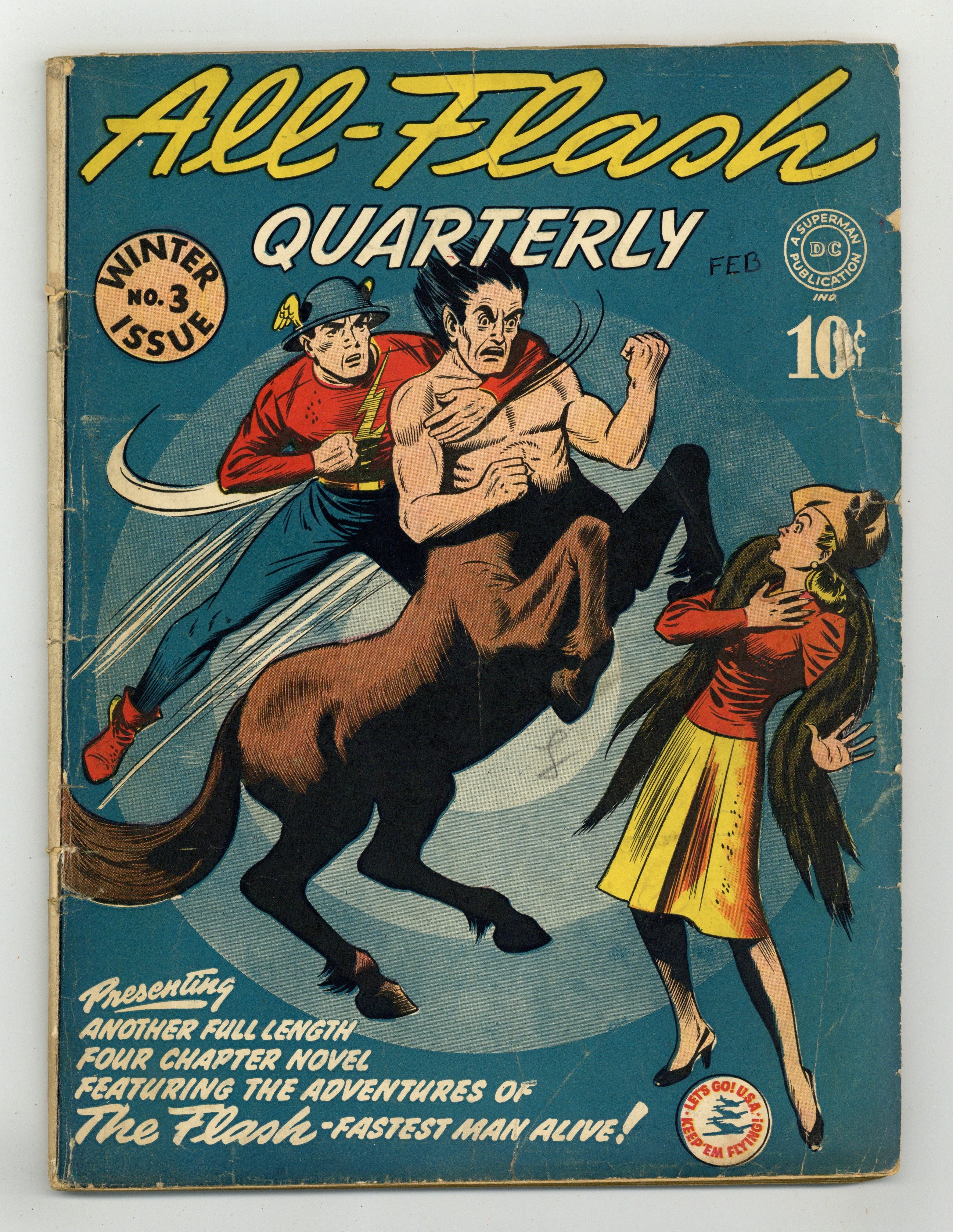 Written by Gardner F. Fox. Art and cover by Everett E. Hibbard. The Flash investigates the activities of a research scientist named Addams, who has a theory that the human face is shaped by glandular activities of the body. Addams plots to treat people with his special formula in order to make them look like prominent men who he plans to kidnap and replace with a phony. How to Develop Your Speed with the Flash. Butch McLobster story by Ed Wheelan. Hop Harrigan text story by Evelyn Gaines. The Flash Presents His Hall of Speed Records. 68 Pages, Full Color. Cover price $0.10. Grade: GD+ 2.5 explanation of grade Condition: Used (collectible)