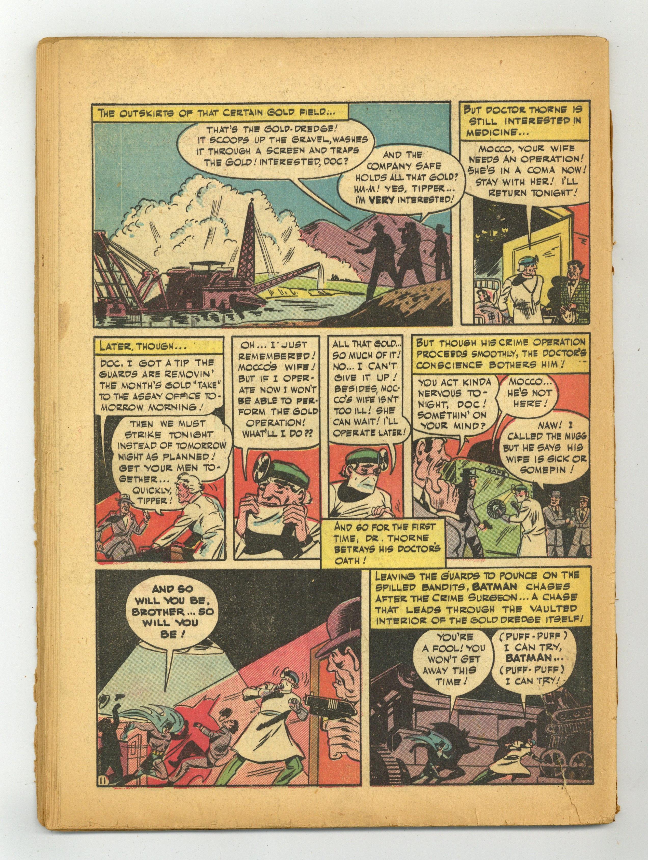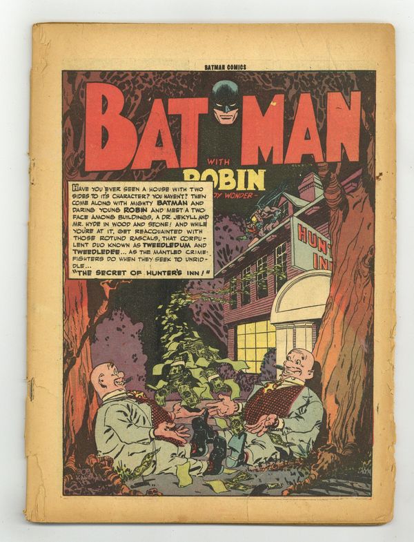 Cover pencils by Ed Kressey, Dick Sprang, and Stan Kaye, inks by Dick Sprang and Stan Kaye. "The Secret of Hunter's Inn!", script by Joe Samachson, pencils by Jerry Robinson (as Bob Kane), inks by Jerry Robinson (as Bob Kane); Batman and Robin, in their everyday identities as Bruce Wayne and Dick Grayson (accompanied by Alfred), are investigating Hunter's Inn, the scene of many robberies of wealthy patrons and run into the Tweed Brothers. One-page Private Pete story by Henry Boltinoff. "Robin Studies His Lessons!", script by Joe Samachson, pencils by Bob Kane, inks by Jerry Robinson; When Dick brings home a miserable report card, Bruce relegates the youngster to studying at home instead of gallivanting about as Robin, the Boy Wonder! One-page Chief Hot Foot story by Henry Boltinoff. "The Good Samaritan Cops," script by Bill Finger, pencils by Jack Burnley (as Bob Kane), inks by Jack Burnley (as Bob Kane) and Ray Burnley (backgrounds); In the first story of a series, Batman and Robin meet and work with different agencies within the realm of the Police Department: in this story, it's the Police Emergency Squad. "Boarders Away!" text story by Tod Lowry. "The Crime Surgeon!", script by Bill Finger, pencils by Bob Kane, inks by Jerry Robinson; The Crime Surgeon, after successfully operating on and saving the life of the Warden at the prison he is incarcerated in, makes good his escape and re-opens his Crime Clinic: an agency that helps crooks to better carry out their crimes! 60 Pages, Full Color. Cover price $0.10. Grade: Coverless explanation of grade Condition: Used (collectible)