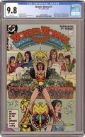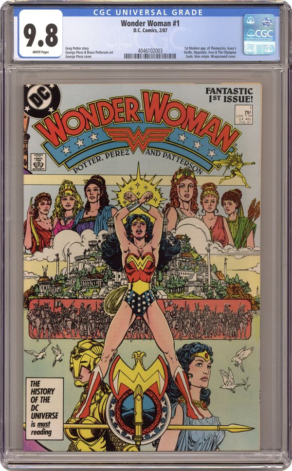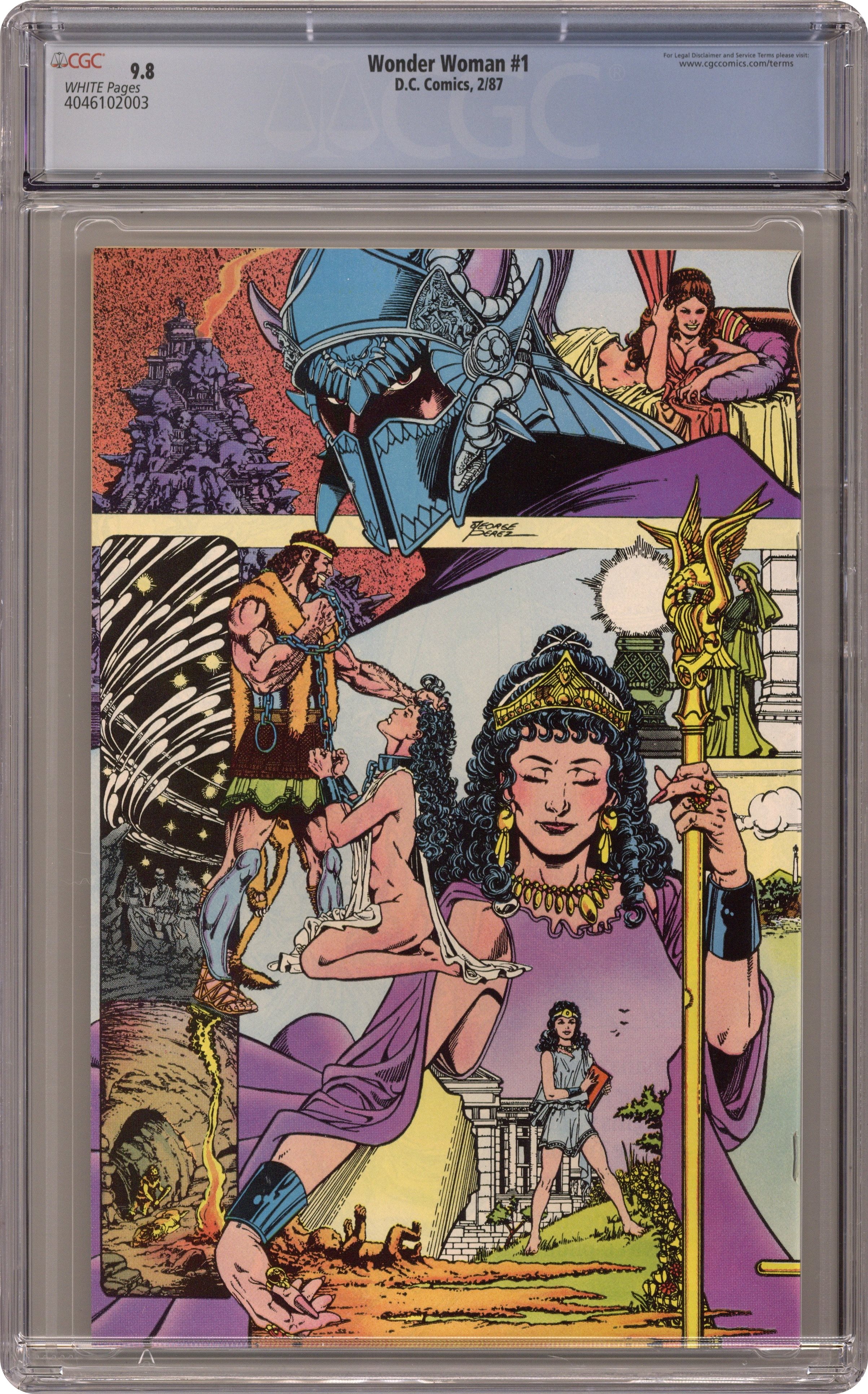 Direct Edition. In this post-Crisis on Infinite Earths re-imagining of the Wonder Woman mythos, Diana is born of clay, growing on Paradise Island to become the champion of the Amazons. "The Princess and the Power!" Part 1 of 6, continued next issue. Script by Greg Potter, co-plot and pencils by George Perez, inks by Bruce Patterson. Perez inks first 2 pages and the final page. Wrap-around cover. No ads. Perez cover. 36 pgs. Cover price $0.75. Grade: CGC 9.8 explanation of grade Condition: Used (collectible)