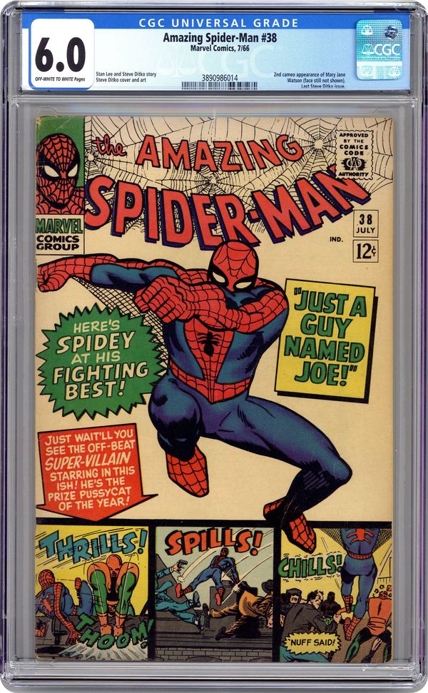 Cover art by Steve Ditko. Second appearance of Mary Jane (cameo; face not shown) in Just a Guy Named Joe!, script by Steve Ditko (Plot) and Stan Lee, art by Steve Ditko; Average joe, Joe Smith, fails at being a fighter and tries his hand at acting; Dressed up as a robotic monster, he is zapped with electricity and chemicals which causes him to go on a violent spree against those who doubted his abilities; Meanwhile, Norman Osborn puts a price on Spidey's head and our hero is plagued with goons trying to bump him off; Pete narrowly misses meeting Mary Jane. This is Ditko's final issue of Spider-Man. Reprinted in Marvel Tales # 177. 36 pgs. $0.12. Cover price $0.12. Grade: CGC 6.0 explanation of grade Condition: Used (collectible)