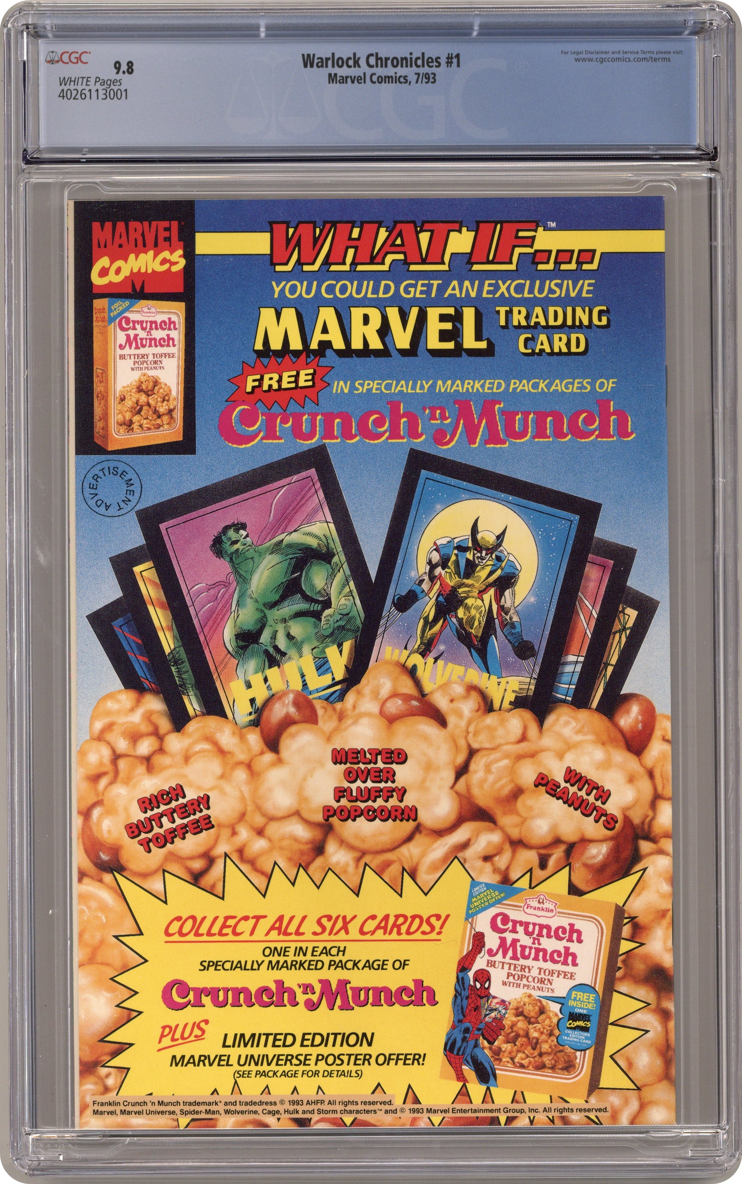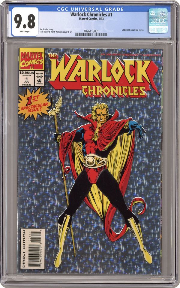 Holografix and embossed cover, art by by Tom Raney and Keith Williams. Things Past, script by Jim Starlin, pencils by Tom Raney, inks by Keith Williams; Infinity Crusade crossover; Darklore reviews the history of Adam Warlock and tries to take his Infinity Gem. 36 pgs., full color. $2.95. Cover price $2.95. Grade: CGC 9.8 explanation of grade Condition: Used (collectible)
