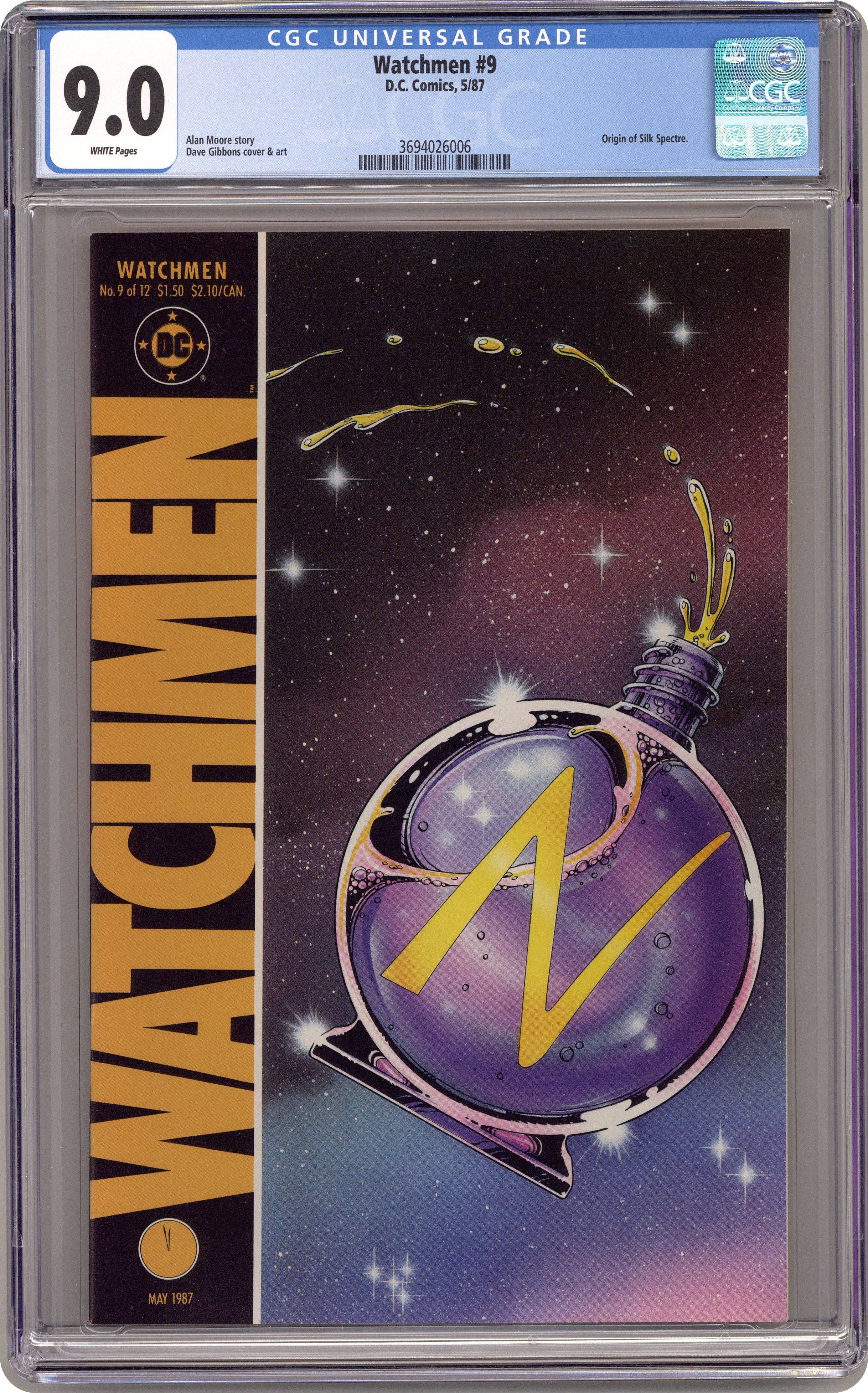 "The darkness of mere being". Part 9 of 12. Story by Alan Moore. Art and cover by Dave Gibbons. As the Silk Spectre attempts to convince Dr. Manhattan to return to Earth, she learns the shocking truth about her parentage. Includes four page fictional text feature with pieces from the scrapbook of Sally Jupiter. 32 pages. Full color. No ads. Cover price $1.50. Grade: CGC 9.0 explanation of grade Condition: Used (collectible)