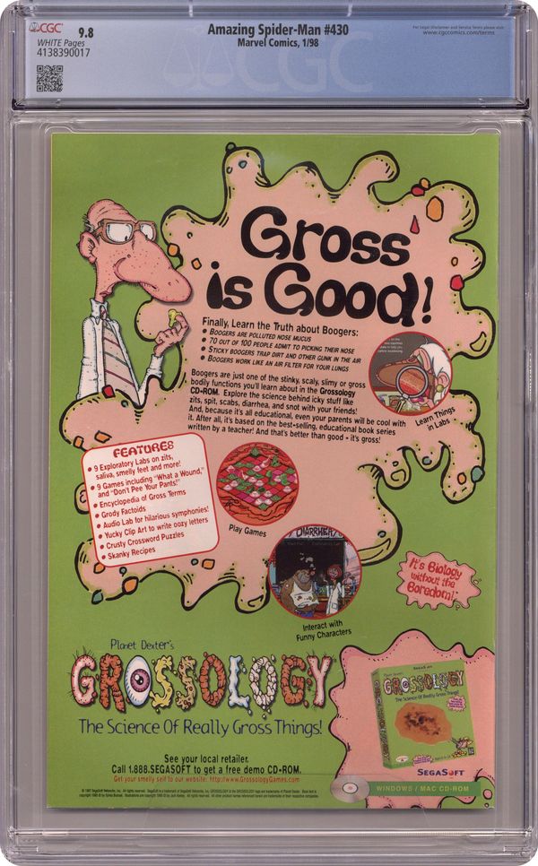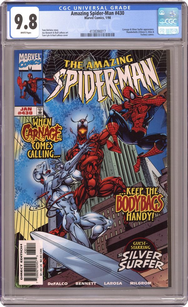 Direct Edition. Cover pencils by Tom Lyle, inks by Bud LaRosa. Carnage and the Silver Surfer guest star in "Savage Rebirth!", script by Tom DeFalco, pencils by Joe Bennett, inks by Bud LaRosa; Spider-Man rejoices that the Avengers have been confirmed to be alive; He begins dealing with the one million dollar reward the Bugle has on him; He heads toward the Baxter Building to visit the Fantastic Four, only to remember that the Thunder Bolts recently purchased the building; Peter agrees to quit being Spider-Man, as Mary meets up with Jill; Dr. Ashley Kafka, the new director of the Ravencroft Institute wants to shut down the microwave field holding back Cletus Kasady in order to cut costs. Cameos by Captain America, Iron Man, and the Vision. 38 pgs., full color. $1.99. Cover price $1.99. Grade: CGC 9.8 explanation of grade Condition: Used (collectible)