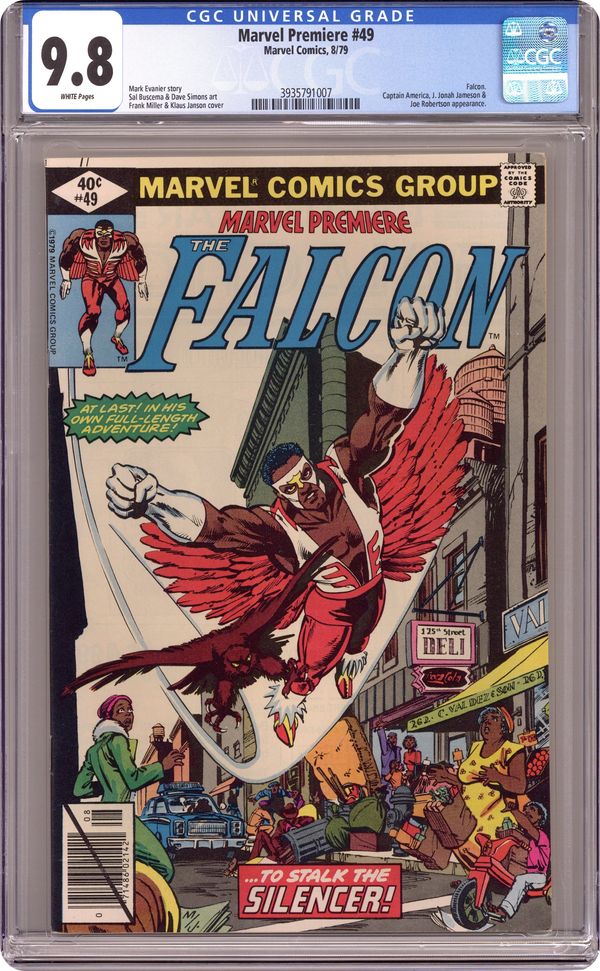 Cover pencils by Frank Miller, inks by Klaus Janson. Sound of the Silencer, script by Mark Evanier, pencils by Sal Buscema, inks by Dave Simons; Bodavian diplomat, Sigjid Roskoff, is killed by the masked villain, the Silencer; The Falcon figures out that the murderer is Count Barzon, a fellow Bodavian who killed Roskoff for political reasons and who used the Silencer identity to throw the authorities off his trail. Brief Captain America appearance. Cameo from J. Jonah Jameson (from Spider-Man comics). 36 pgs. $0.40. Cover price $0.40. Grade: CGC 9.8 explanation of grade Condition: Used (collectible)