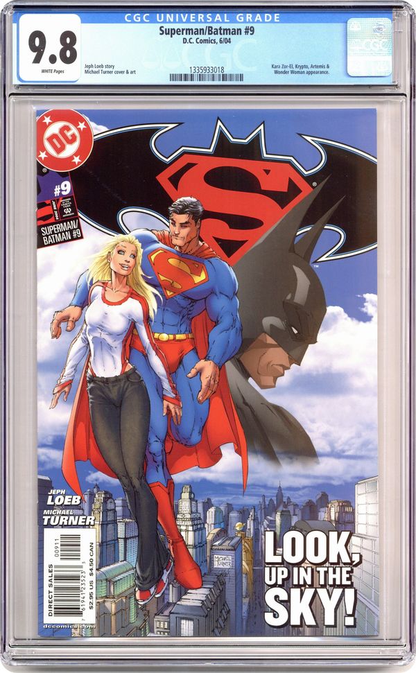 WRITTEN BY JEPH LOEB; ART AND COVER BY MICHAEL TURNER Jeph Loeb and Michael Turner continue the thrilling saga "The Supergirl From Krypton!," part 2 of 6. The mysterious girl trapped inside the Kryptonite meteor that fell to Earth is taken to the Fortress of Solitude, where Superman and Batman try to teach her to fit into our society. But on Apokolips, someone else has plans for her, as do the Amazons! FC, 32 PG. $2.95 Cover price $2.95. Grade: CGC 9.8 explanation of grade Condition: Used (collectible)