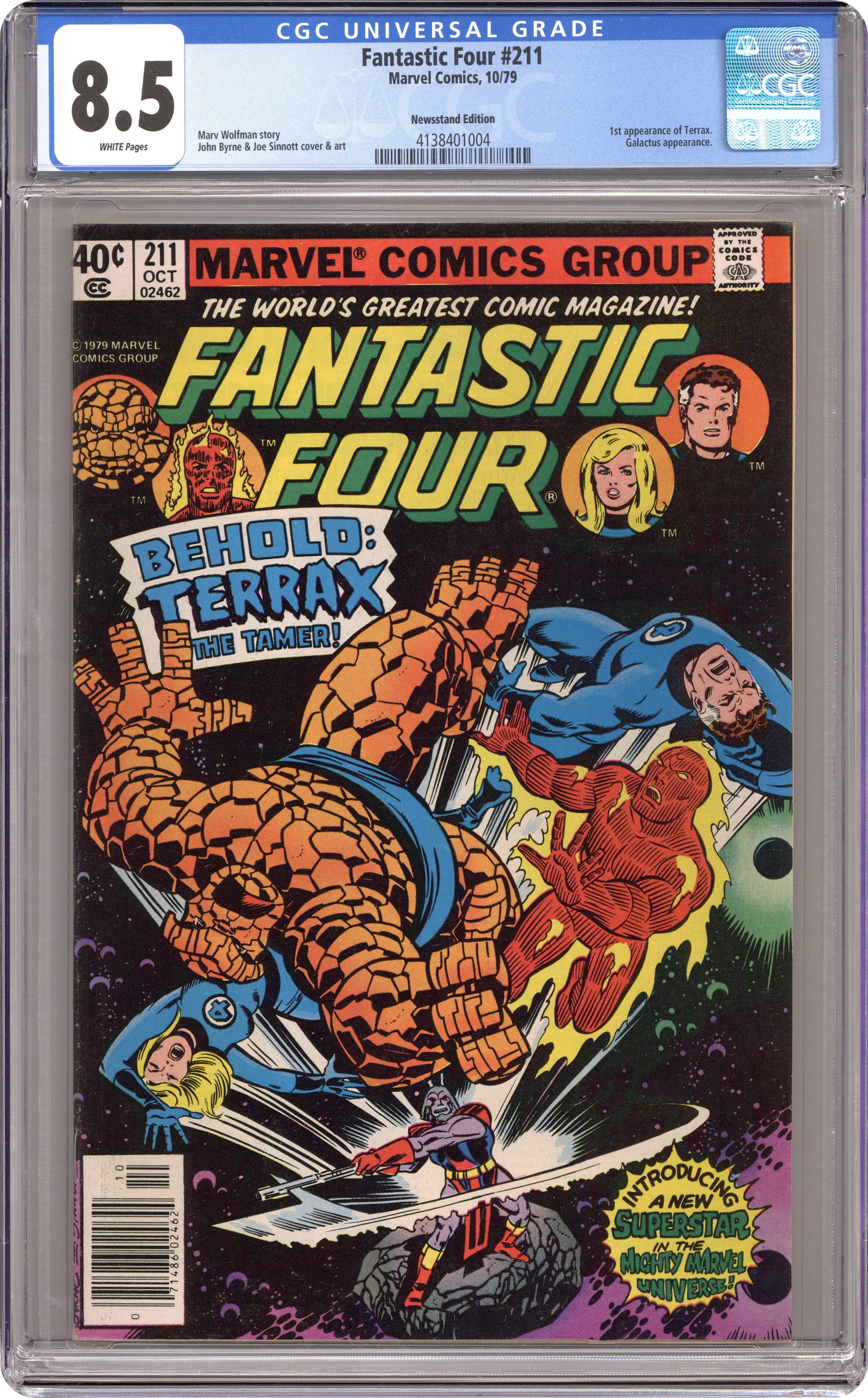 Direct Edition. 1st appearance of Terrax the Tamer - "If This Be Terrax" Written by Marv Wolfman. Pencils by John Byrne. Inks by Joe Sinnott. Cover by John Byrne and Joe Sinnott. Galactus sends the Fantastic Four to an alien plant to capture its tyrannical ruler named Tyros! Can the three aging members of the FF plus the Human Torch muster the strength to defeat Tyros? Cameo appearance by the Watcher and flashback appearances by the Silver Surfer, Air Walker, and Firelord. Note: First appearance of Terrax the Tamer. 36 pgs. Cover price $0.40. Grade: CGC 8.5 explanation of grade Condition: Used (collectible)