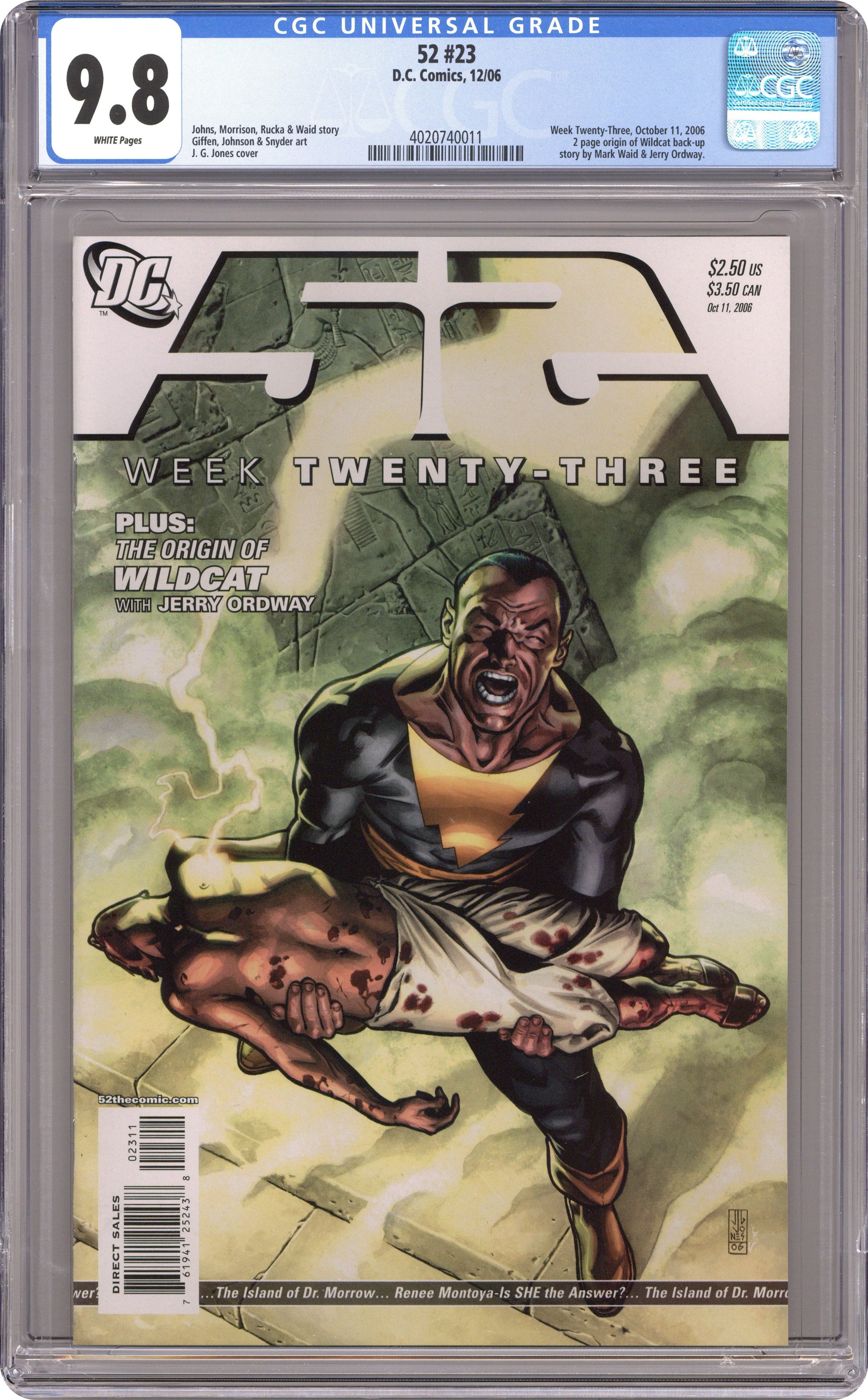 Written by Geoff Johns, Grant Morrison, Greg Rucka, Mark Waid. Breakdowns by Keith Giffen. Art by various. Backup features by Mark Waid and Jerry Ordway. Covers by J.G. Jones. The story of the year continues in four more chapters of America's only weekly super-hero adventure! WEEK 23: 'Look what these monsters did to your brother, Isis! They deserve a slow death! Plucked apart like the insects they are!' Plus, the Origin of Wildcat. Cover price $2.50. Grade: CGC 9.8 explanation of grade Condition: Used (collectible)