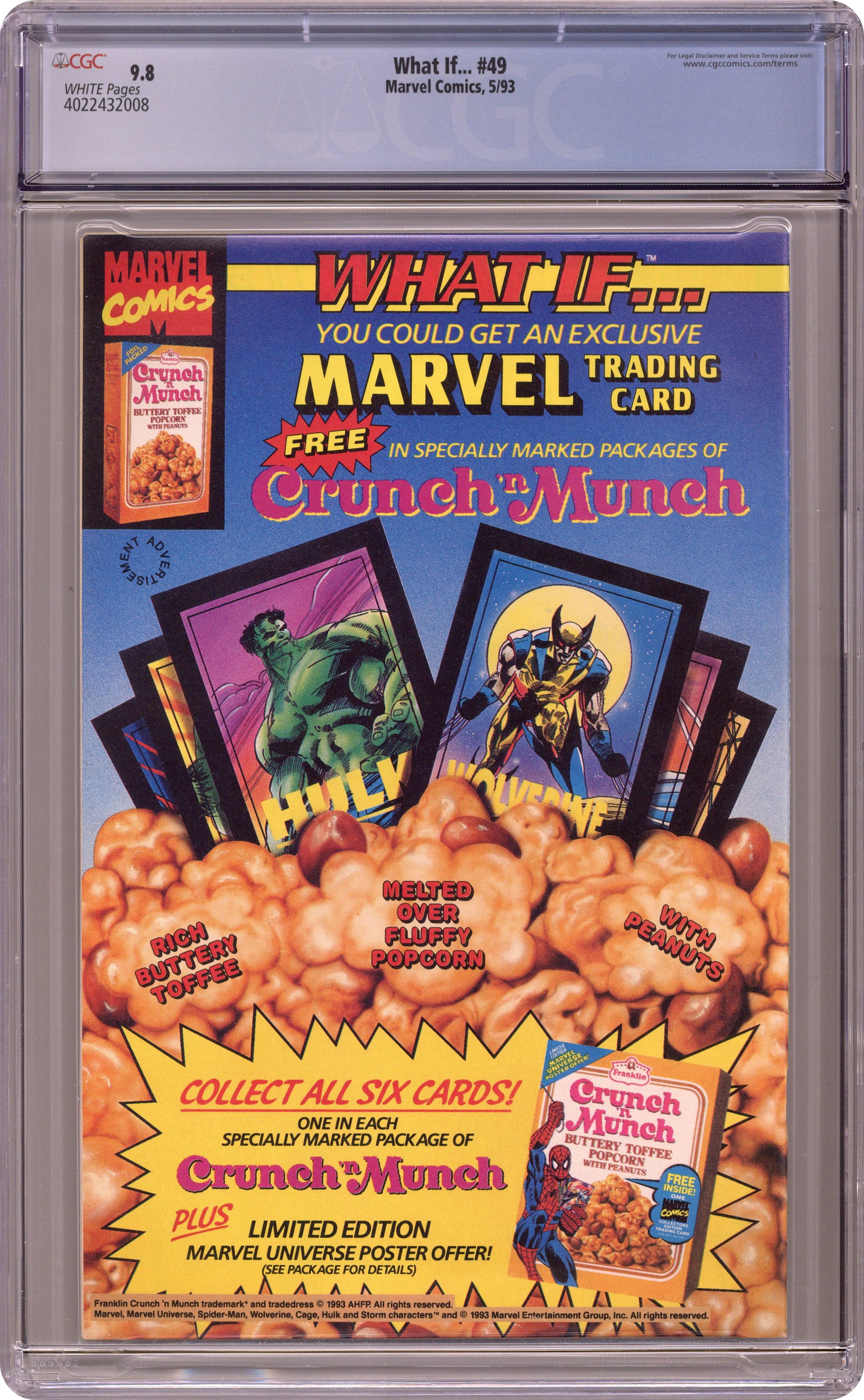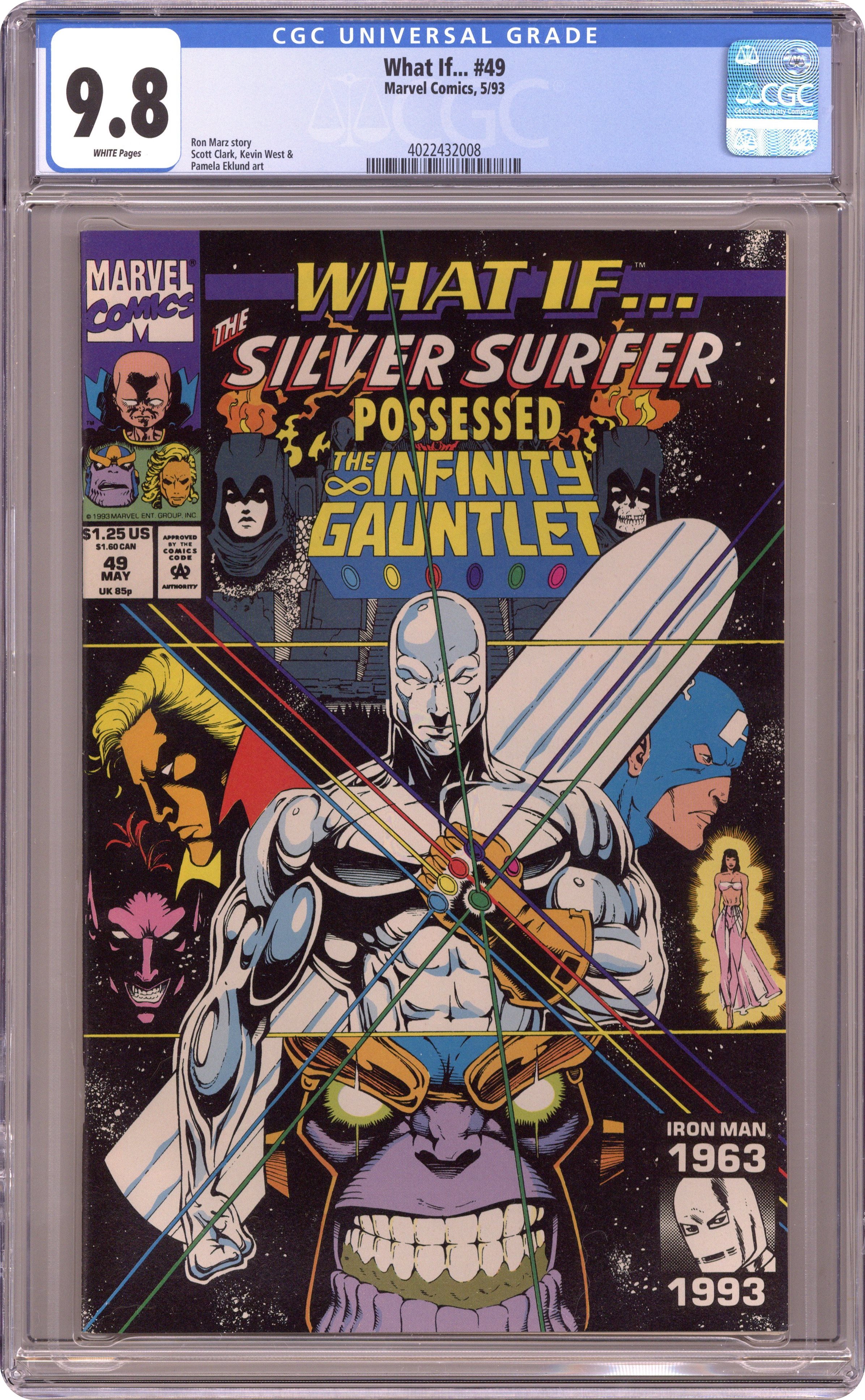 "What If the Silver Surfer Possessed the Infinity Gauntlet?" Script by Ron Marz, pencils by Scott Clark (with Kevin West), inks by Pamela Eklund. Guest starring Thanos and Adam Warlock. Appearances by Captain America, Mephisto, Doctor Strange, and Shalla-Bal. Cameos by Galactus, Wolverine, Cyclops, the Hulk, the Scarlet Witch, the Sub-Mariner, She-Hulk, Eros, the Vision, Cloak, Firelord, Drax the Destroyer, Thor, Nova, Quasar, Iron Man, Spider-Man, Doctor Doom, Nebula, Terraxia, and Captain Marvel. Cover price $1.25. Grade: CGC 9.8 explanation of grade Condition: Used (collectible)