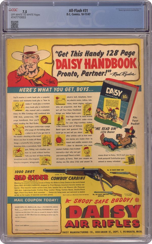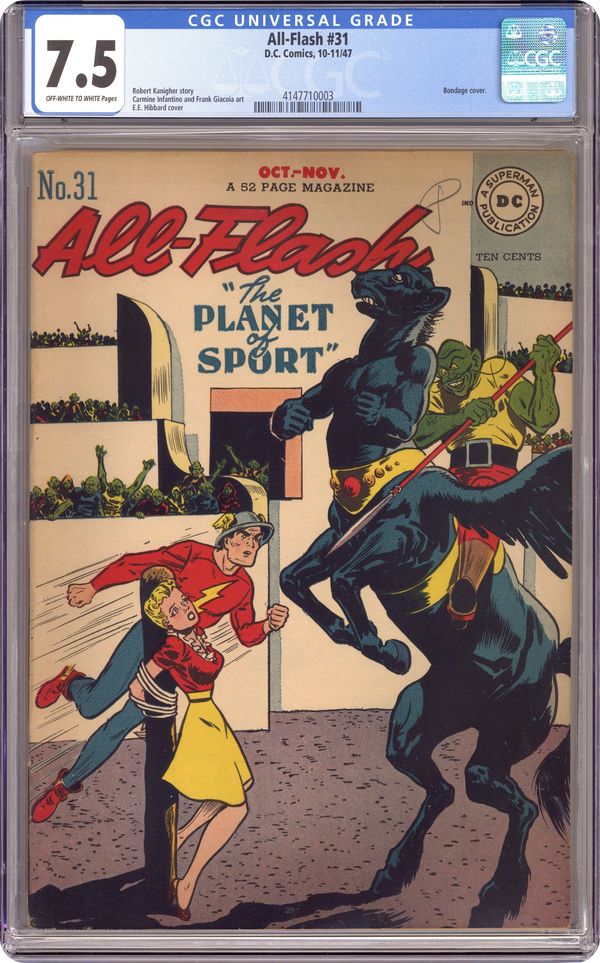 Written by Robert Kanigher. Art by Carmine Infantino and Frank Giacoia. Cover by Everett E. Hibbard. Newspaper publisher Dale Thomas finds the body of a former fellow explorer in the newspaper presses in his plant. This man had once discovered a secret city in the jungles of the Amazon, and Thomas, accompanied by the Flash and Dr. Flura, are determined to find that city and rescue reporter Jim Ronson, no matter what the cost! Written by Robert Kanigher. Art by Lee Elias and Moe Worthman. By a strange twist of fate, the personalities of a meek, mild-mannered bank clerk and a professional boxer are exchanged, a switch that keeps the Flash on his toes! Ton o' Fun story by Harry Lampert. 52 Pages, Full Color. Cover price $0.10. Grade: CGC 7.5 explanation of grade Condition: Used (collectible)