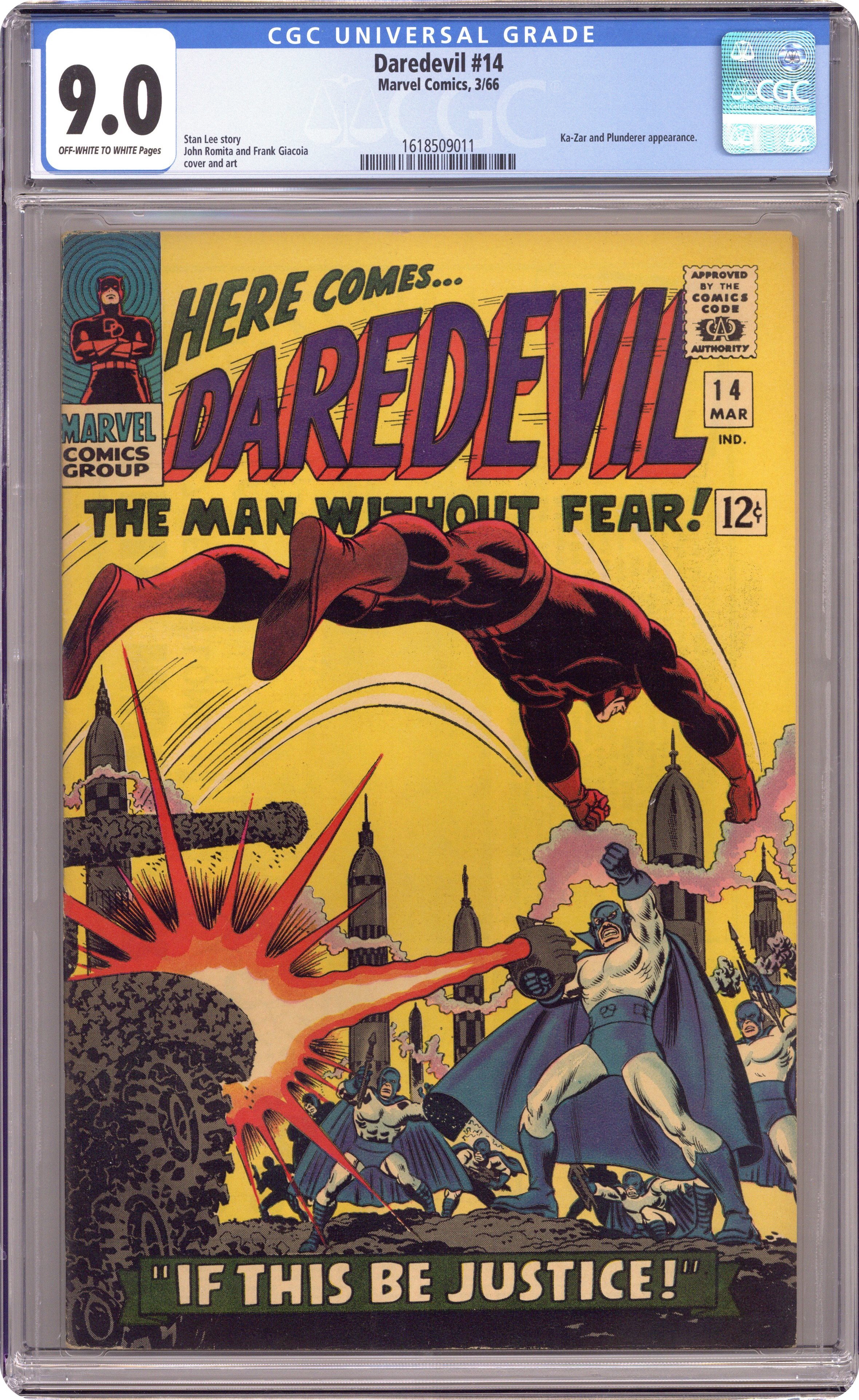 Cover pencils by John Romita, inks by Frank Giacoia. If This Be Justice, script by Stan Lee, pencils by John Romita, inks by Frank Giacoia; The Plunderer gets his hands on Ka-Zar's half of their father's medallion and uses the mytical Plunder-Stone to start taking over the world; DD gets in the way and helps take the would be world conqurer down; Foggy and Karen show up in England to defend Ka-Zar against trumped up charges his brother brought against him. 36 pgs. Cover price $0.12. Cover price $0.12. Grade: CGC 9.0 explanation of grade Condition: Used (collectible)