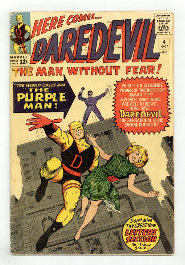 Cover pencils by Jack Kirby, inks by Vince Colletta. First appearance of the Purple Man in Killgrave, the Unbelievable Purple Man!, script by Stan Lee, pencils by Joe Orlando, inks by Vince Colletta; DD runs up against a purple man who can make anyone do what he wants just by suggesting it. First letters page. 36 pgs. Cover price $0.12. Cover price $0.12. Grade: GD+ 2.5 explanation of grade Condition: Used (collectible)
