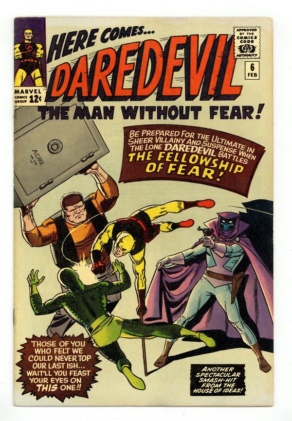 Cover art by Wally Wood. First appearance of Mr. Fear in "Trapped by the Fellowship of Fear!" Script by Stan Lee, art by Wally Wood. The Fellowship of Fear includes Mr. Fear, the Ox, and the Eel. Cameos (Mr. Fear's sculptures) by Captain America, Electro, the Owl, Rama-Tut, Mysterio, Spider-Man, the Chameleon, Dr. Doom, the Hatemonger, Diablo, the Beetle, Kraven, Baron Zemo, Iron Man, the Toad, Mr. Doll, the Black Knight, Egghead, the Hulk, the Melter, Cyclops, the Vulture, the Thing (of the Fantastic Four), Dr. Octopus, Dr. Strange, Loki, Thor, the Super Skrull, the Cobra, Magneto, Giant Man, and the Green Goblin!; DD intrudes on a phony movie shoot where the Fellowship of Fear is robbing a bank and gets himself blasted by fear gas; Mr. Fear decides to flush DD out by creating a wax figure of Hornhead for his museum; DD and Foggy both get in a brawl with the Fellowship, and Foggy is injured; DD returns to the wax museum to put an end to the Fellowship. 36 pgs. Cover price $0.12. Cover price $0.12. Grade: VG+ 4.5 explanation of grade Condition: Used (collectible)