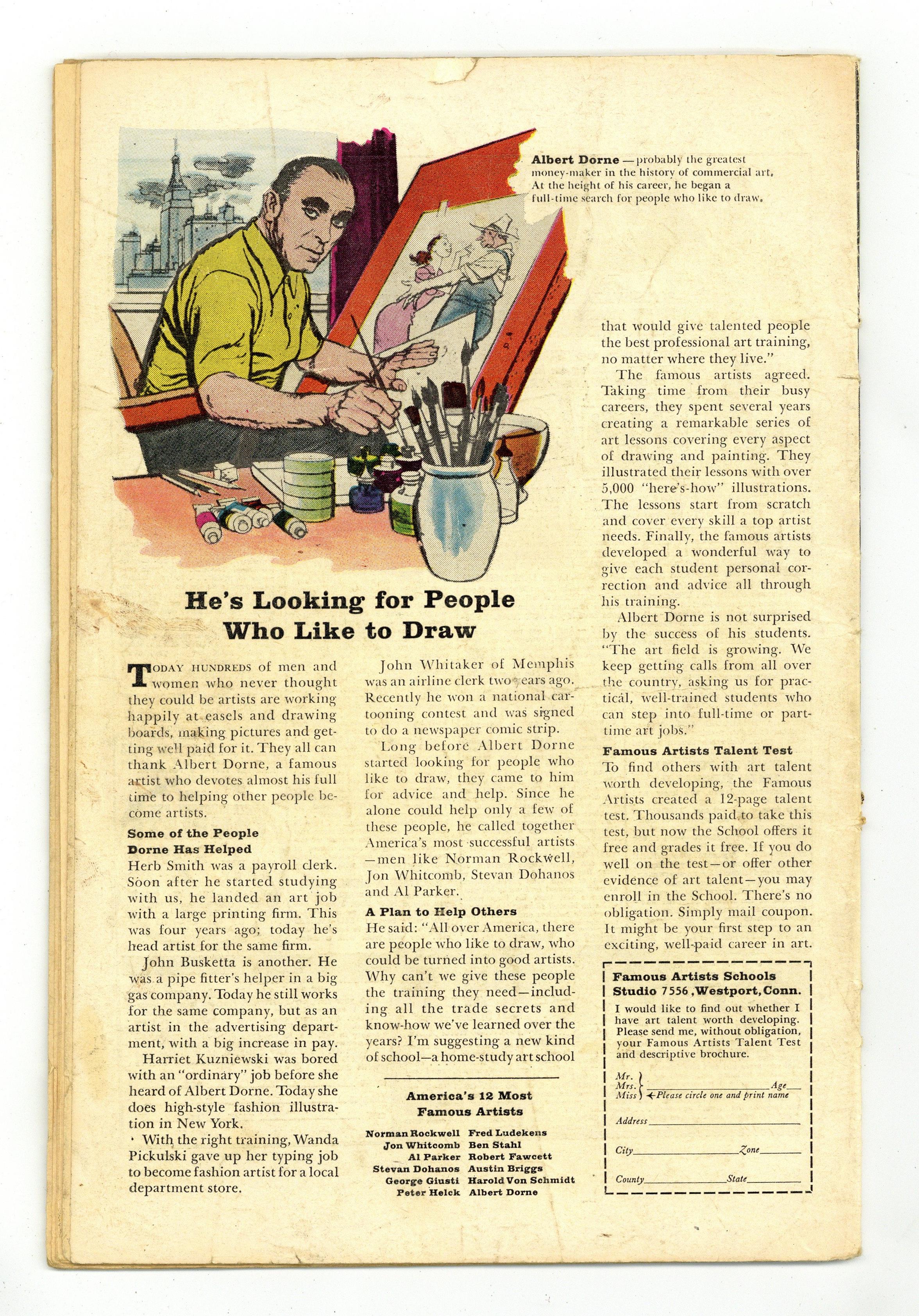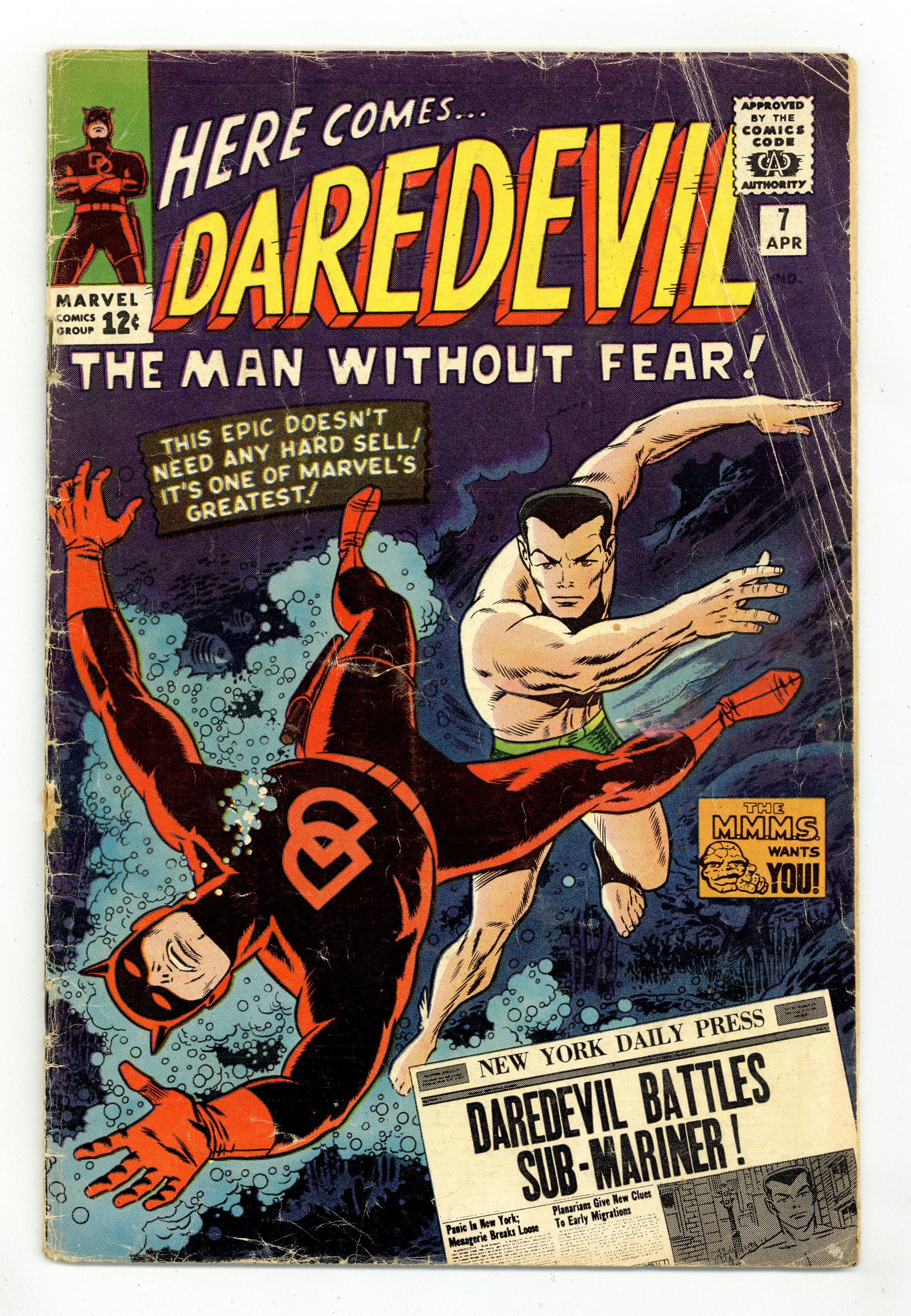 "In Mortal Combat with Sub-Mariner!" Written by Stan Lee. Art and cover by Wally Wood. Namor hires Franklin and Murdock to sue the human race on his behalf. When this doesn't work, he gets himself arrested so he can have his day in court. Realizing humanity won't listen, the Sub-Mariner goes on a rampage which brings Daredevil into the (hopeless) fray. Namor returns to the sea out of respect for DD and to stop Krang from taking over Atlantis. Sub-Mariner/Daredevil pin-up by Wood. Note: First appearance of Daredevil's red costume. 36 pages, full color. Cover price $0.12. Grade: GD 2.0 explanation of grade Condition: Used (collectible)