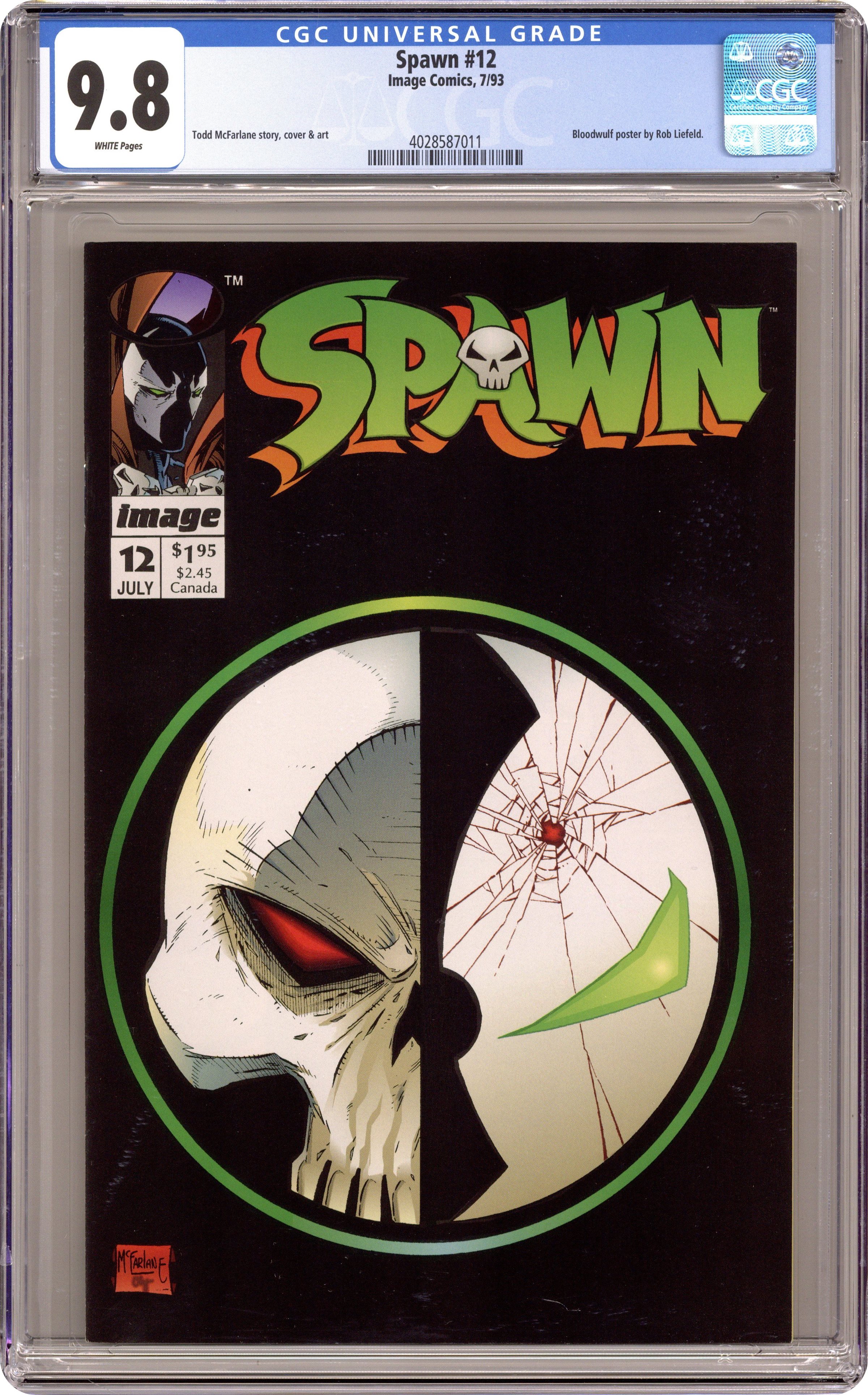 Direct Edition. Story and art by Todd McFarlane. "Flashback!" Part 1 of 2. Chapel cameo. Spawn finally learns the identity of the man who pulled the trigger and murdered Al Simmons, and his identity comes as quite a shock. Includes a poster of Blood Wulf by Rob Liefeld. Cover price $1.95. Grade: CGC 9.8 explanation of grade Condition: Used (collectible)