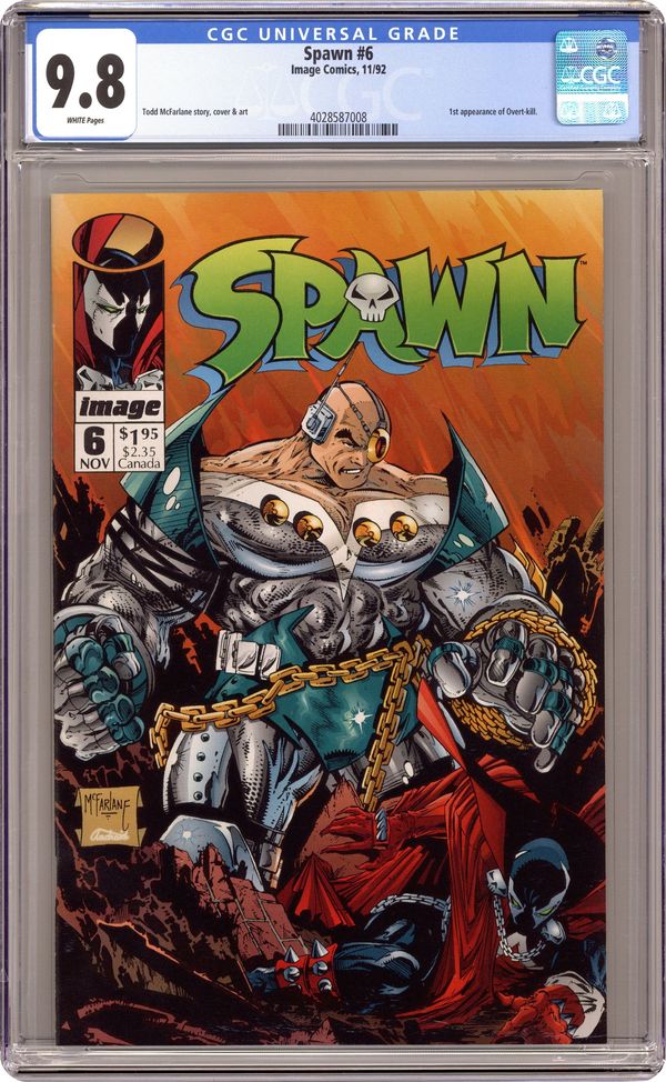 "Payback!" Part 1 of 2. 1st appearance of Overtkill. Created, story, and art by Todd McFarlane. Mafioso boss, Tony Twist, blames the new shadowy hero, Spawn, for the resent attacks on his men. Twist wants Spawn dead. Twist is a man who is used to getting what he wants. Enter: Overtkill, a cyborg killing machine who never fails. NOTE: Overtkill was created on an art training video featuring Stan Lee, Todd McFarlane, and Rob Liefeld. When Lee came up with the name "Overkill," Liefeld and McFarlane, using only the name, and within a matter of minutes, came up with the basic design for the character that would soon be known as Overtkill, a major villain in the Image Universe. - Odinson, Lone Star Comics Archivist Cover price $1.95. Grade: CGC 9.8 explanation of grade Condition: Used (collectible)