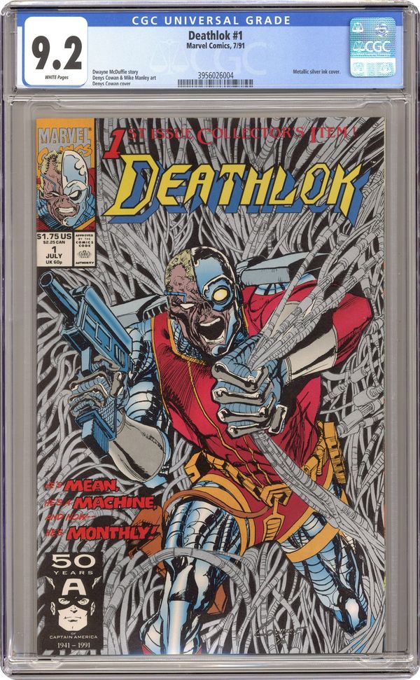 Direct Edition. Cover art by Denys Cowan. The Wolf Is At The Door, script by Dwayne McDuffie and Gregory Wright, pencils by Denys Cowan, inks by Mike Manley; Deathlok stops Harlan Ryker's warwolf from killing others who would testify against Ryker. 36 pgs. $1.75. Cover price $1.75. Grade: CGC 9.2 explanation of grade Condition: Used (collectible)