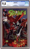 Direct Edition. "In Heaven!" Story by Alan Moore. Art by Todd McFarlane. Includes a B&W poster of Spawn by Frank Miller. Child murderer, Billy Kincaid, awakens in a strange dark place and he is not alone. One by one, the members of his group are taken, destroyed, or devoured by the macabre denizens of this foreboding place. One by one, until only Kincaid and small child remain. When this sick man cannot deny his base instincts, he soon learns that there are fates worse than death when one is sent to Hell! Cover price $1.95. Grade: CGC 9.8 explanation of grade Condition: Used (collectible)