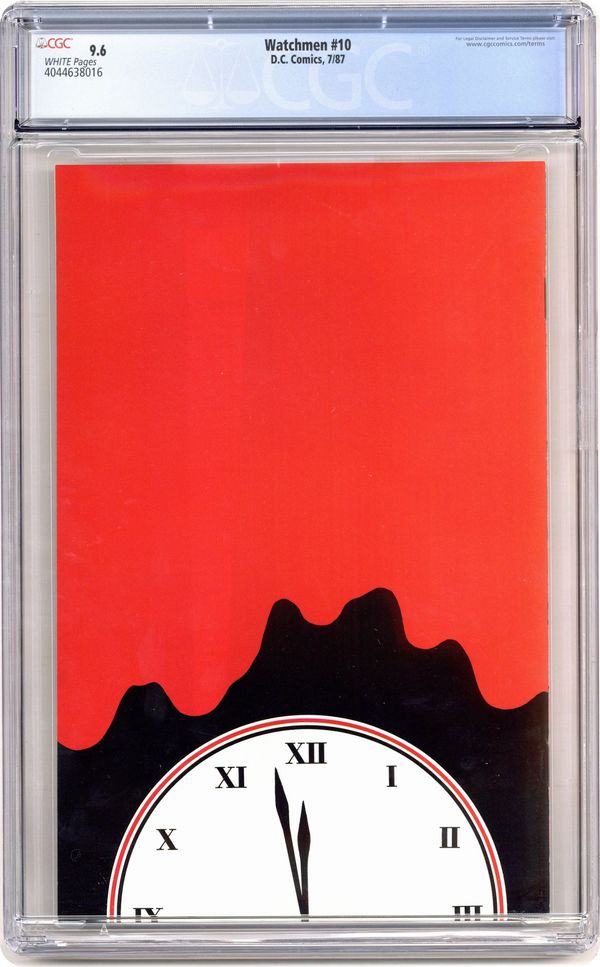 "Two riders were approaching". Part 10 of 12. Story by Alan Moore. Art and cover by Dave Gibbons. Rorschach and Night Owl continue their detective work and finally discover who is behind the conspiracy. This is not a good thing. Includes four page fictional text feature with a view of Adrian Veidt's scrapbook. 32 pages. Full color. No ads. Cover price $1.50. Grade: CGC 9.6 explanation of grade Condition: Used (collectible)