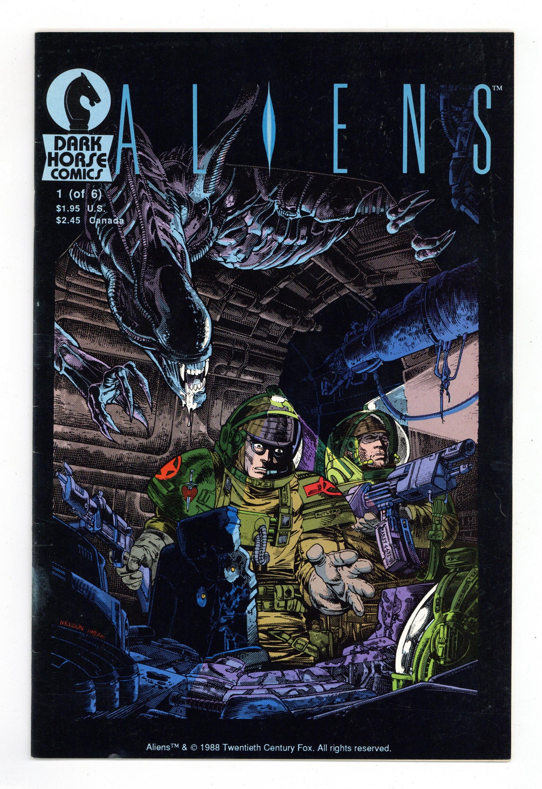 1st printing - Written by Mark Verheiden. Art and cover by Mark A. Nelson. In deep space, a salvage crew is attacked by seemingly unstoppable monsters. The marines are called in, but they need someone with experience. Soon Hicks (the horribly scarred survivor from Aliens) and Newt (now almost eighteen) find themselves on a mission to locate and destroy the Aliens' homeworld! 32 pages, B&W. Cover price $1.95. Grade: FN- 5.5 explanation of grade Condition: Used (collectible)