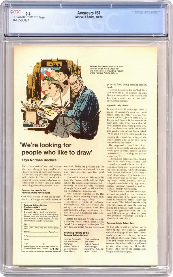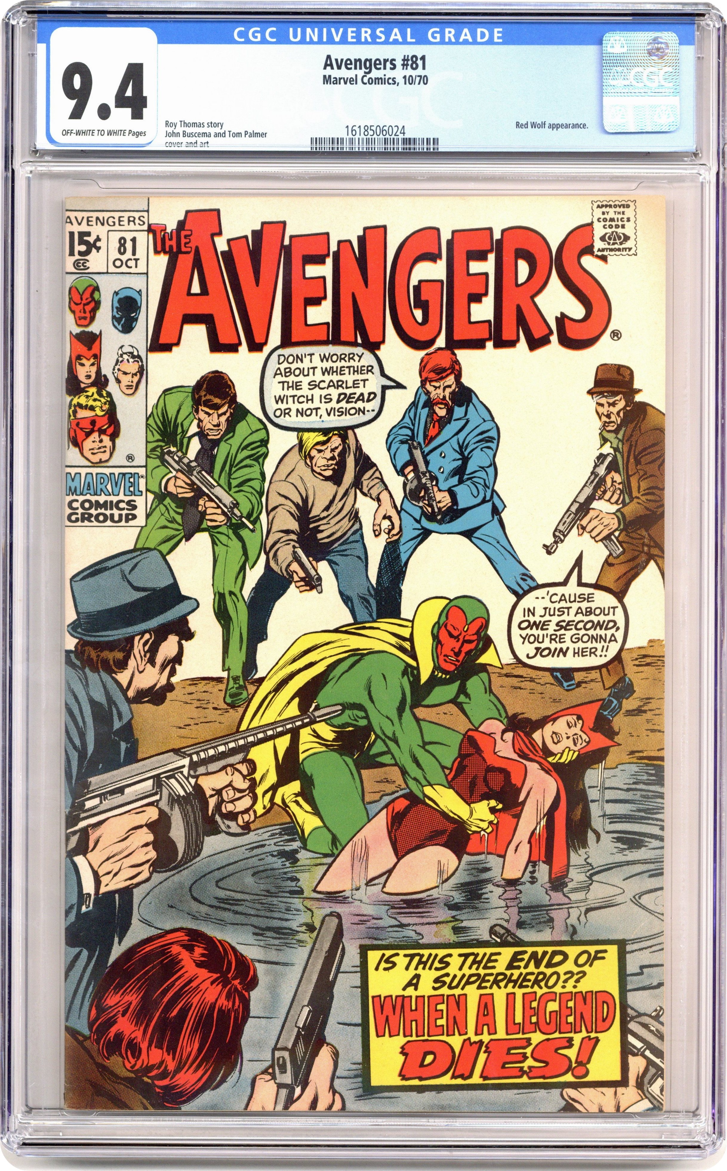"When Dies A Legend!" Part 2 of 3. Script by Roy Thomas. Pencils by John Buscema. Inks by Tom Palmer. Cover by John Buscema and Tom Palmer. The Avengers are splitting up, but not permanently! Just long enough to take care of a double threat! While half the team searches for the Zodiac in New York City; the Vision, Scarlet Witch, and Goliath fly west to the Great Plains to help Red Wolf stop Cornelius Van Lunt's violent land grab! However, a mid-air ambush in the Montana sky quickly derails the Avengers' mission! After the Vision saves Wanda (as foreshadowed on the cover), Van Lunt captures both of them and forces the Vision to fight Goliath! The devious Cornelius has everything going his way until Red Wolf and his fellow tribesmen set dynamite to Van Lunt's precious concrete dam! Can the Indian legend from decades ago reclaim his sacred homeland? And lead the Avengers to victory? Avengers Lineup: Black Panther, Captain America, Goliath, Iron Man, Quicksilver, Scarlet Witch, Thor, and the Vision. (Notes: Cornelius Van Lunt returns in Avengers 120. Red Wolf appears next in Red Wolf 7.) 36 pages. Cover price $0.15. Grade: CGC 9.4 explanation of grade Condition: Used (collectible)