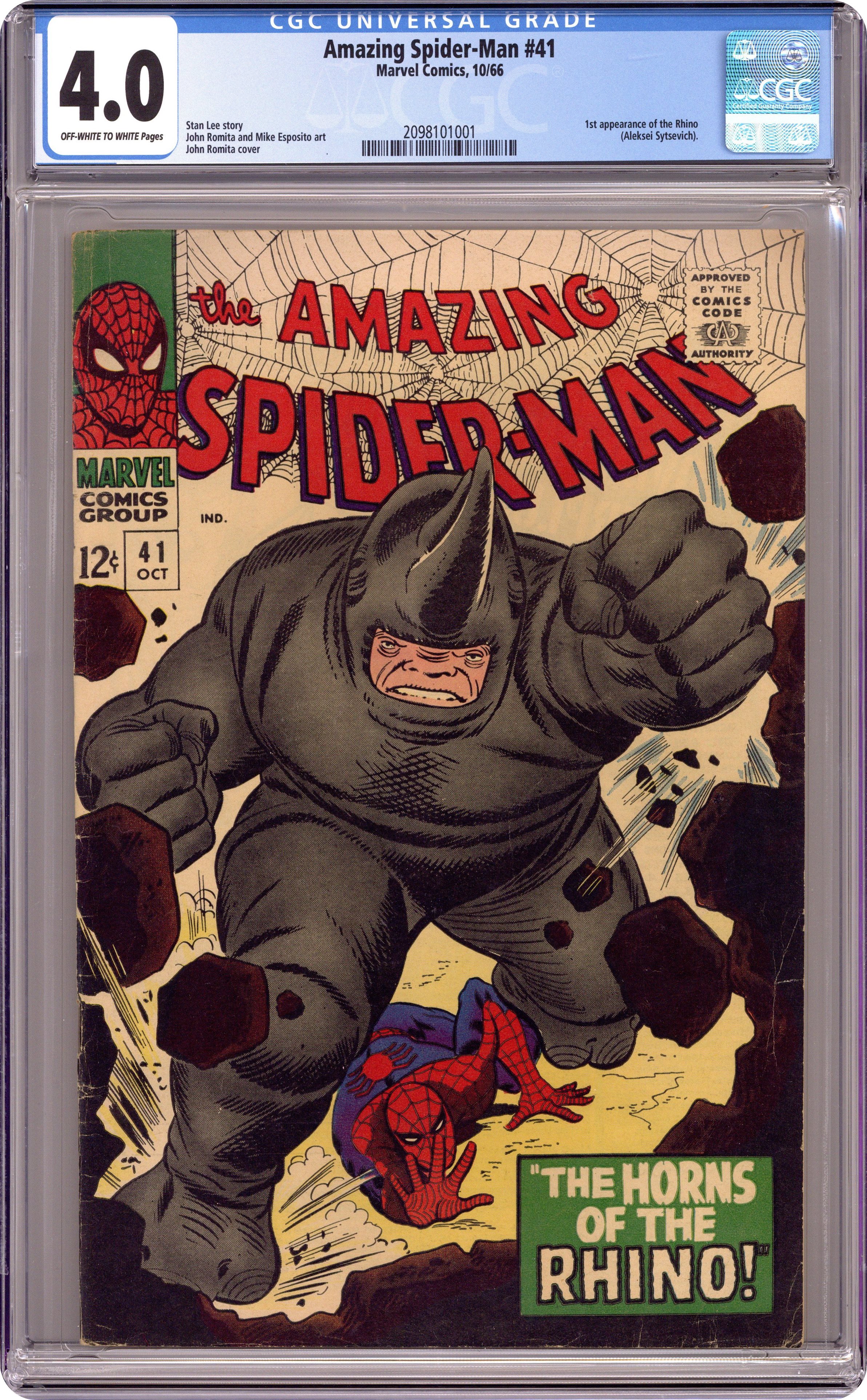 Cover pencils by John Romita Sr., inks by Mike Esposito and John Romita (touch-ups). First appearance of the Rhino in The Horns of the Rhino!, script by Stan Lee, pencils by John Romita Sr., inks by Mike Esposito (as M. Demeo) and John Romita Sr. (touch-ups); The Rhino attempts to kidnap John Jameson to turn him over to foreign powers that want his secrets about the U.S. space program; Spider-Man manages to stop the Rhino. Reprinted in Marvel Tales # 30 and 190. 36 pgs., full color. $0.12. Cover price $0.12. Grade: CGC 4.0 explanation of grade Condition: Used (collectible)
