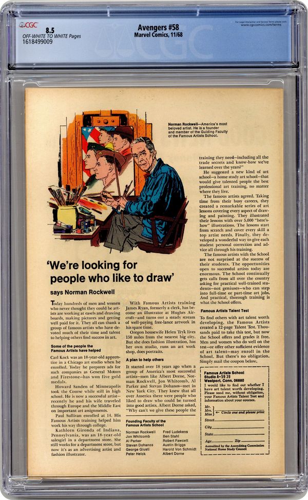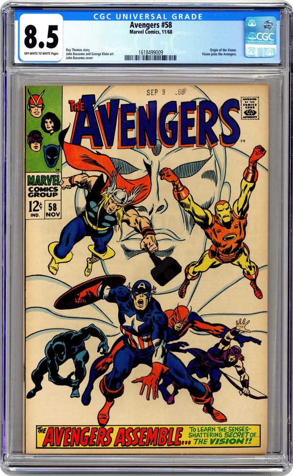 "Even An Android Can Cry" Part 2 of 2. Origins of the Vision and Ultron. Script by Roy Thomas. Pencils by John Buscema. Inks by George Klein. Cover by John Buscema and George Klein. The Vision wants to become an avenger! But before Goliath and the Wasp can add him to the roster, they must consult the old guard first! When Captain America, Iron Man, and Thor arrive at Avengers Mansion; they test the Vision's powers! And the three stalwarts are suitably impressed! But they also want to know the Vision's background story. Where did he come from and how was he created? As the Vision recounts his earliest memories, Hank Pym begins to connect the dots.Earth's Mightiest Heroes rush to Hank's suburban lab... where they learn the shocking truth about their newest ally: the Vision; and their newest enemy: Ultron! Does the truth clear the way for the Vision to join the Mighty Avengers? An uplifting story! Second appearance of the silver age Vision. Flashback cameos by the Enchantress, Executioner, Baron Zemo, Wonder Man, and Ultron. Avengers Lineup: Black Panther, Captain America, Goliath, Hawkeye, Iron Man, Thor, and the Wasp. (Notes: Roy Thomas and John Buscema's creations of the Vision and Ultron set the stage for decades of great Avengers stories. This issue features a full-page panel (page 9) of all the avengers to date plus Spider-Man. This two-part story was reprinted in 1986 in the Marvel Illustrated paperback: Avengers, The Origin of The Vision. This issue was reprinted in Marvel Super Action #19.) 36 pages. Cover price $0.12. Grade: CGC 8.5 explanation of grade Condition: Used (collectible)