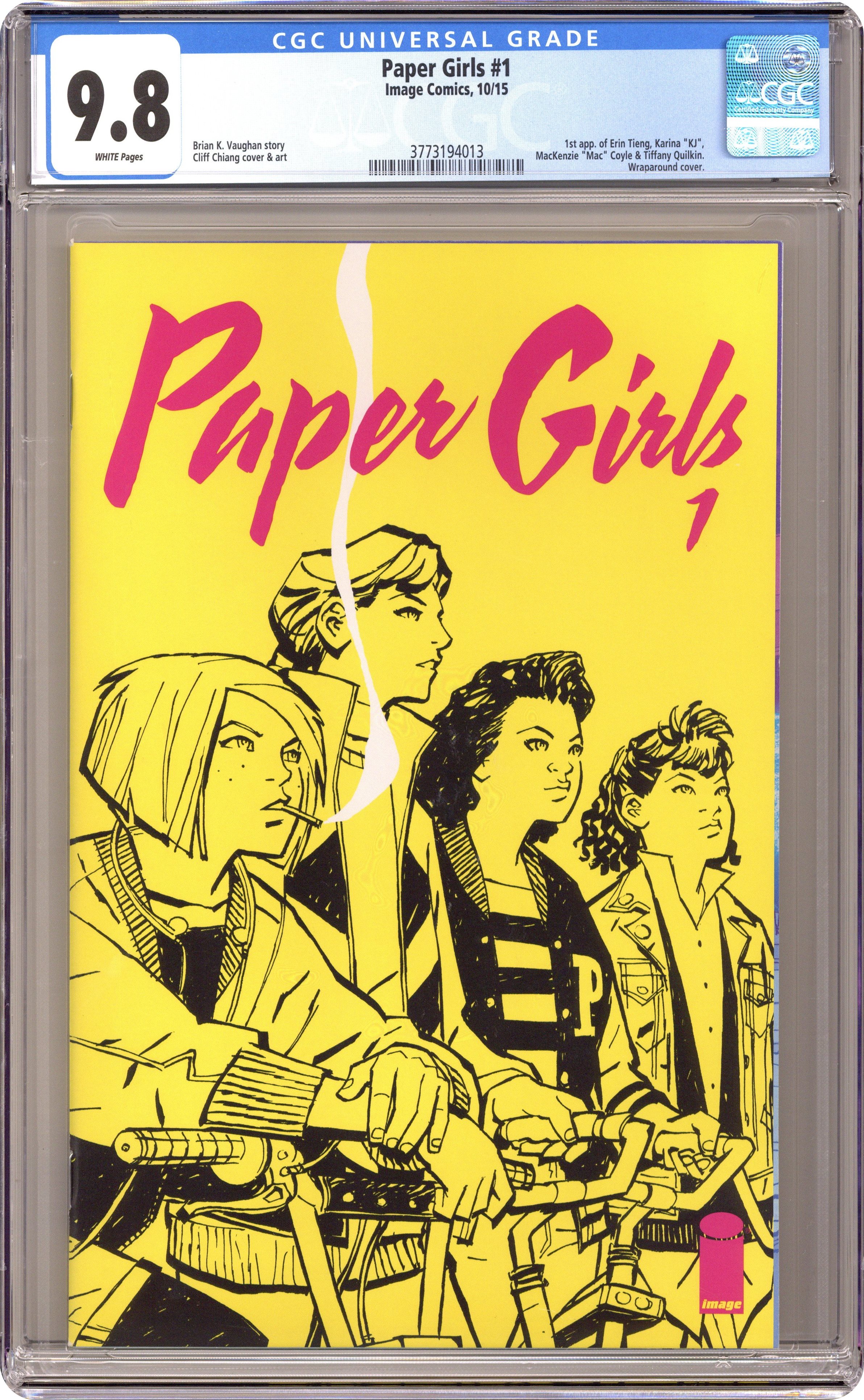 Ended Oct 19 2024 Winning Bid $28 Written by Brian K. Vaughan. Art and Cover by Cliff Chang. In the early hours after Halloween of 1988, four 12-year-old newspaper delivery girls uncover the most important story of all time. Stand By Me meets War of the Worlds in this mysterious young adult adventure! 48 pages, full color. Rated T+ Cover price $2.99. Grade: CGC 9.8 explanation of grade Condition: Used (collectible)