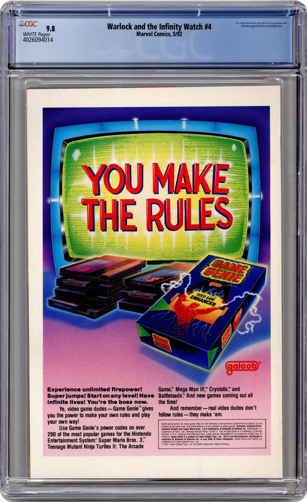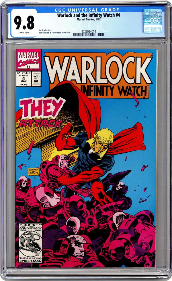 "They!" Story by Jim Starlin. Art by Rick Leonardi and Terry Austin. With superior technology and for reasons unknown, 'They' hunt the High Evolutionary. Unable to defend himself in his current mental state, the High Evolutionary will surely fall. It falls on Adam Warlock to protect is old friend from impending doom. Meanwhile, the rest of the Infinity Watch has been systematically taken prisoner by unknown forces. 32 pages. Cover price $1.75. Grade: CGC 9.8 explanation of grade Condition: Used (collectible)