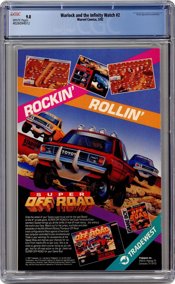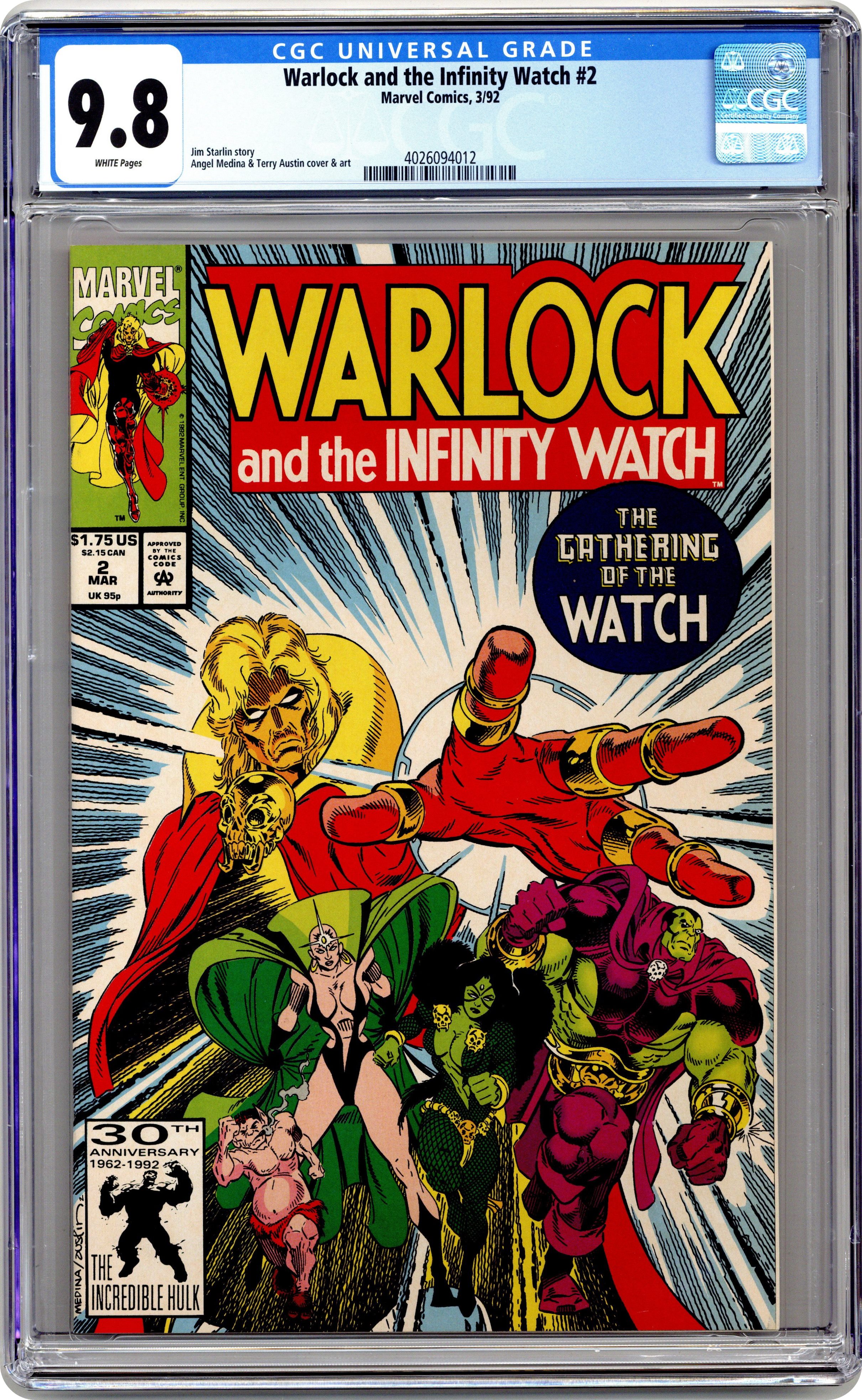 Direct Edition. "Gathering the Watch!" Starfox cameo. Story by Jim Starlin. Art by Angel Medina and Terry Austin. Deemed too powerful to reside together, Adam Warlock must dismantle the Infinity Gauntlet and separate the Infinity Gems. But, each gem on it's own is still the too powerful to fall into the wrong hands, thus Warlock must gather an Infinity Watch. Guardians whom he can entrust the ultimate powers over Space, Time, Power, Reality, the Mind, and the Soul. 32 pages. Cover price $1.75. Grade: CGC 9.8 explanation of grade Condition: Used (collectible)