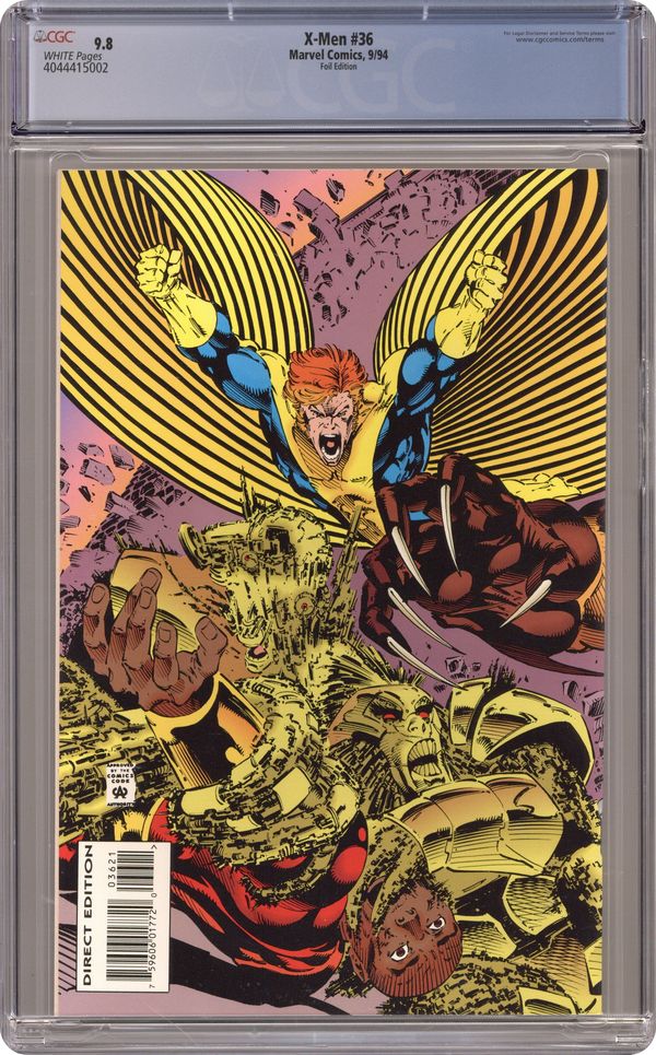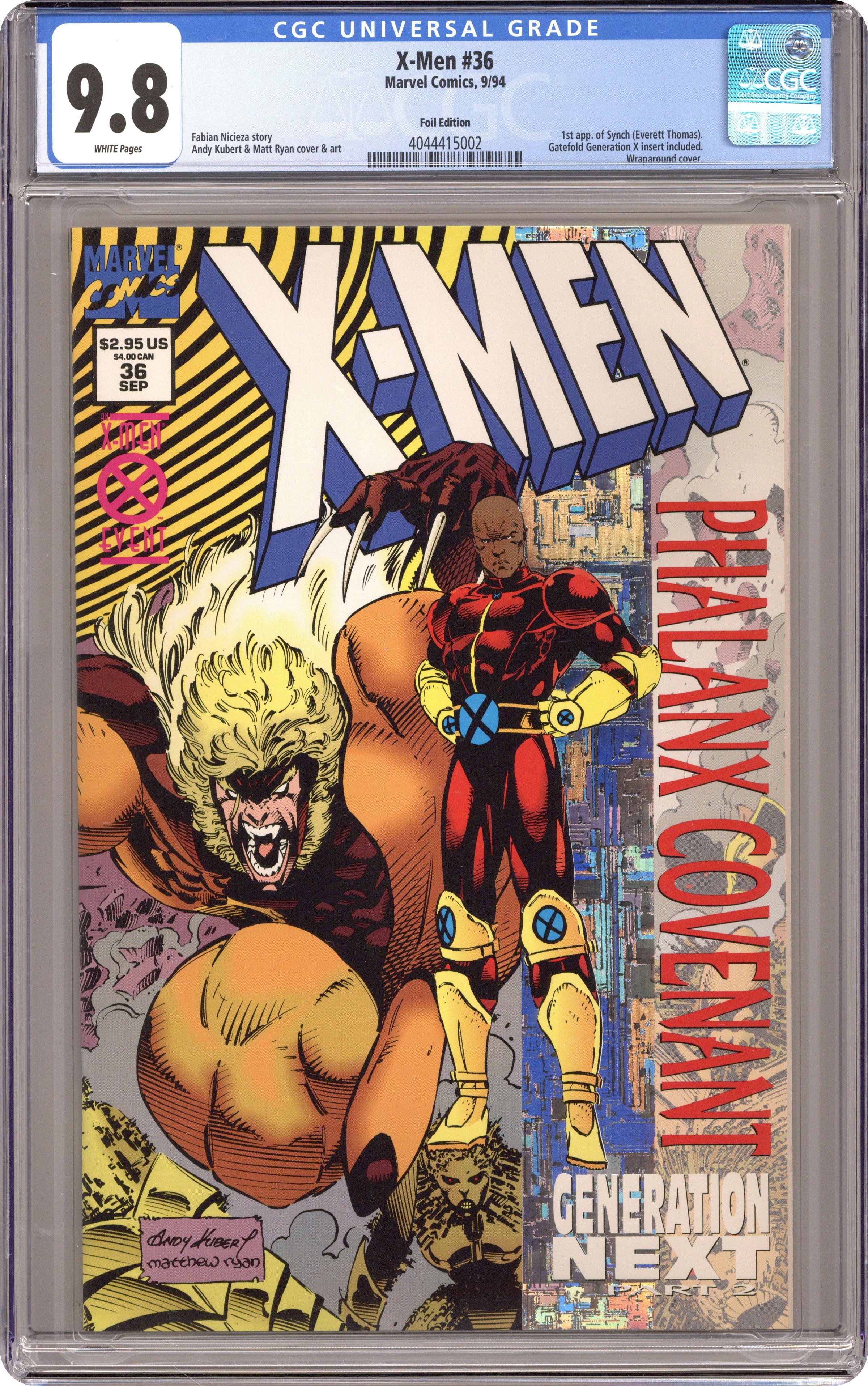 Holographic edition. Direct Edition. Wraparound cardstock cover. Cover pencils by Andy Kubert, inks by Matt Ryan. The Phalanx Covenant Book One Generation Next Part 2: Drop the Leash, script by Fabian Nicieza, pencils by Andy Kubert, inks by Matt Ryan; The X-Men try to save the next generation of mutants from being assimilated by the Phalanx; Cont. from Uncanny X-Men #316; Cont. in Uncanny X-Men #317. 36 pgs. Cover price $2.95. Grade: CGC 9.8 explanation of grade Condition: Used (collectible)
