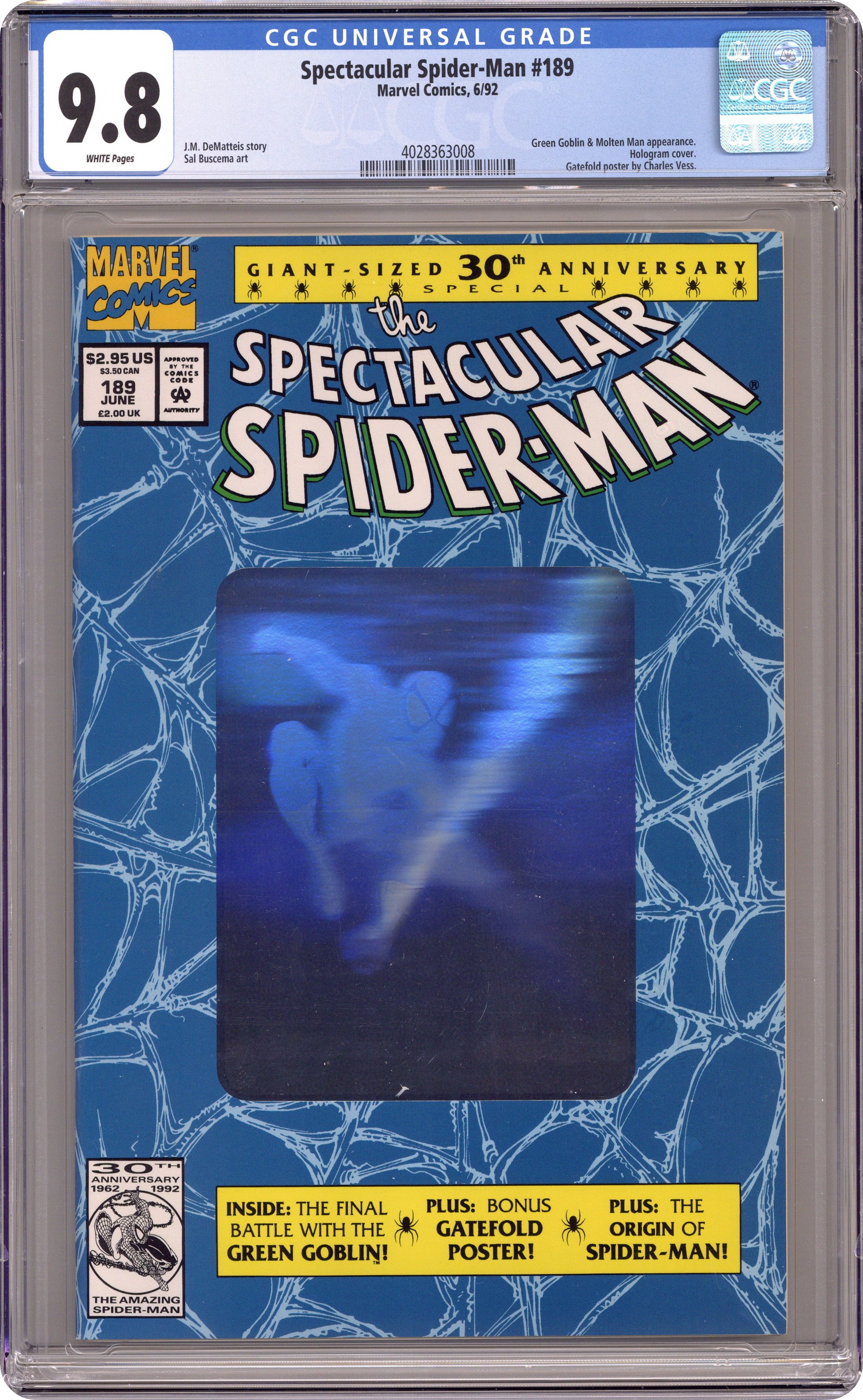 Direct Edition. The Osborn Legacy" First printing. Giant-Sized 30th Anniversary Special Issue. Silver hologram cover. Script by J.M. DeMatteis. Pencils and Inks by Sal Buscema. Harry Osborn has battled psychological problems his entire adult life, but this time hes really gone off the deep end! The Green Goblin kidnaps his wife, son, and brother-in-law (aka the Molten Man) and takes the trio to his fathers old house in the suburbs. For the first time Harry wears the goblin costume in front of his young son. However, Normie doesnt seems to understand the gravity or depravity of the situation and enjoys his fathers ranting and raving while the family sits down for dinner! Fortunately, the goblins diatribe buys the web-slinger time to track down his green and purple foe! And with help from the Molten Man, the Amazing Spider-Man battles the Green Goblin one more time! Second Story: The Night the World Died Script by J.M. DeMatteis. Pencils and Inks by Bob McLeod. Aunt May still has nightmares about the night her husband, Ben Parker, was killed. But her recent encounter with Spider-Man (during the ordeal with the Vulture) has surprisingly brought her comfort. (Notes: This issue includes a fold out poster by Charles Vess featuring Spider-Man and the Hobgoblin. The second printing has a gold hologram cover and was published in November 1992.) 48 pages Cover price $2.95. Grade: CGC 9.8 explanation of grade Condition: Used (collectible)