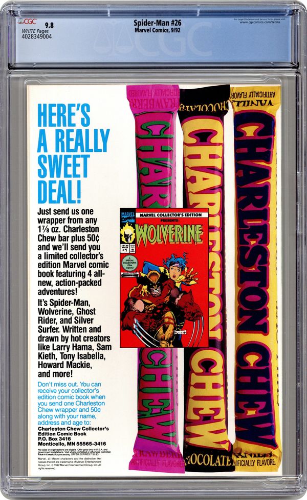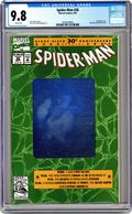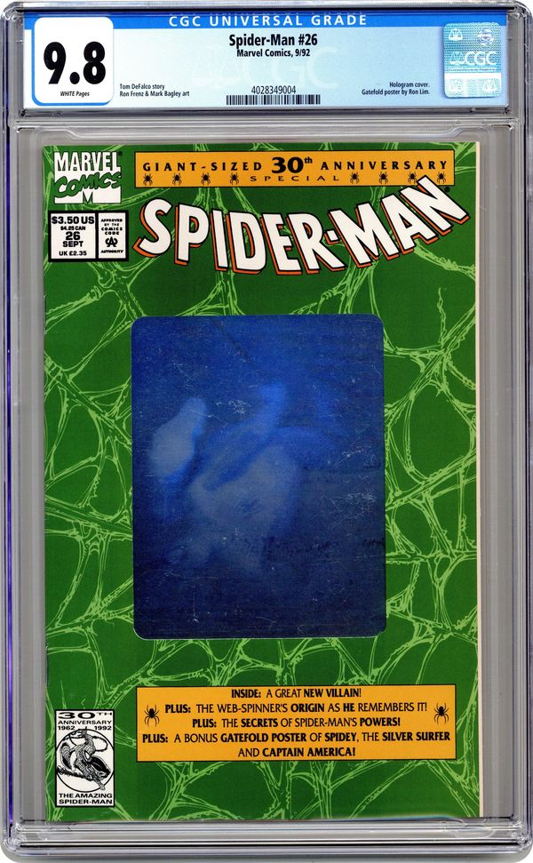 Direct Edition. Giant-Sized 30th Anniversary Special. Silver hologram cover. "With Great Responsibility!" Script by Tom DeFalco. Pencils by Ron Frenz and Mark Bagley. Inks by Klaus Janson, Al Milgrom, Keith Williams, Mark Texeira, Tom Palmer, and Joe Rubinstein. Cover drawing by John Romita Sr. (pencils & inks). While pursuing two small-time criminals, the web-slinger crosses paths with the nephew of the infamous burglar -- who killed his Uncle Ben. After Spider-Man catches the criminals, he has to decide what to do about the nephew -- who might become a burglar too. Appearance by Mary Jane Watson. Retelling of Spider-Man's origin. Second story: "These Great Powers!" Script by Tom DeFalco. Pencils by Mark Bagley. Inks by Sam de la Rosa. Peter explains all his spider-powers to Mary Jane. (Note: This issue includes a gatefold poster featuring Spider-Man, Captain America, and the Silver Surfer by Ron Lim and Jim Sanders III.) 48 pages. Cover price $3.50. Grade: CGC 9.8 explanation of grade Condition: Used (collectible)