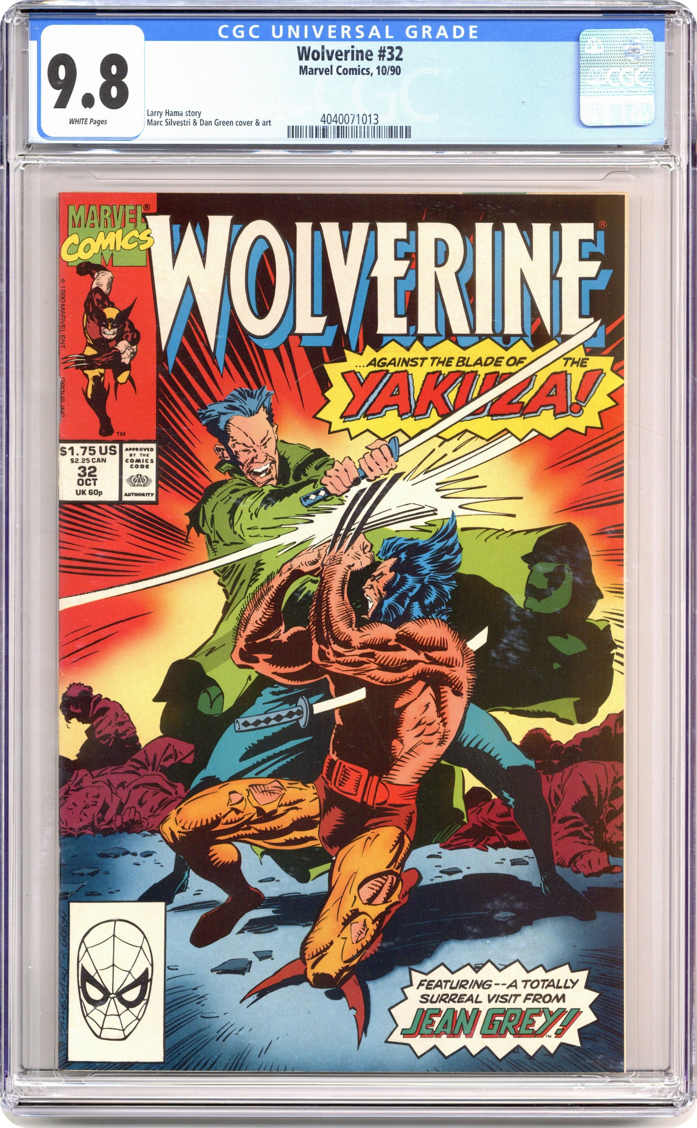 "Terminal Trauma!" Jean Grey Cameo. Written by Larry Hama. Art by Marc Silvestri and Dan Green. Ambushed by two assassins, Wolverine finds himself impaled by a katana blade. If he survives that, can the feral X-Man solve the mystery behind the deadly new drug hitting the streets of Mandripoor. 32 pages, FC Cover price $1.75. Grade: CGC 9.8 explanation of grade Condition: Used (collectible)