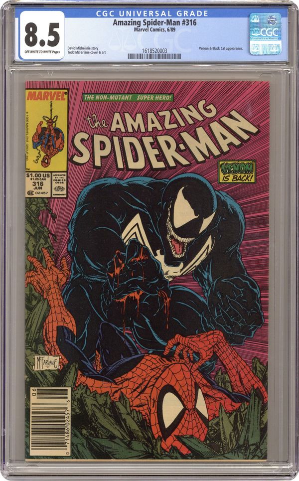 Direct Edition. "Dead Meat" Part 1 of 2. Script by David Michelinie. Art by Todd McFarlane. Cover by Todd McFarlane. Venom is back in New York City! And the deranged Eddie Brock is looking to kill Peter Parker or Spider-Man with extreme prejudice! However, first the psychotic symbiote has to find where the Parkers are living! At the web-slinger's former Bedford Towers residence, Venom runs into and then runs roughshod over the Black Cat! But Felicia doesn't know where the wall-crawler is either! Later on Peter learns that his worst nightmare has returned and his family is in grave danger. Spider-Man can't wait for Venom to make the first move. The web-slinger must attack! Cameo appearances by Aunt May, Glory Grant, and Eduardo Lobo. (Note: This two-part story was reprinted in 1990 in the trade paperback: Spider-Man vs. Venom.) 36 pages. Cover price $1.00. Grade: CGC 8.5 explanation of grade Condition: Used (collectible)