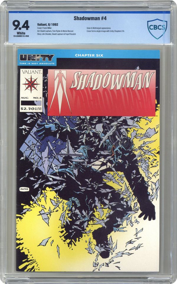 UNITY Chapter 6. Shadowman finds himself side by side with Solar, sun and shadow allied against the One who sits at the center of UNITY. "Sunburn" is written by David Lapham, Jim Shooter and Faye Perozich, with art by David Lapham, Tom Ryder and Maria Beccari. Cover by Frank Miller. Cover price $2.50. Grade: CBCS 9.4 explanation of grade Condition: Used (collectible)