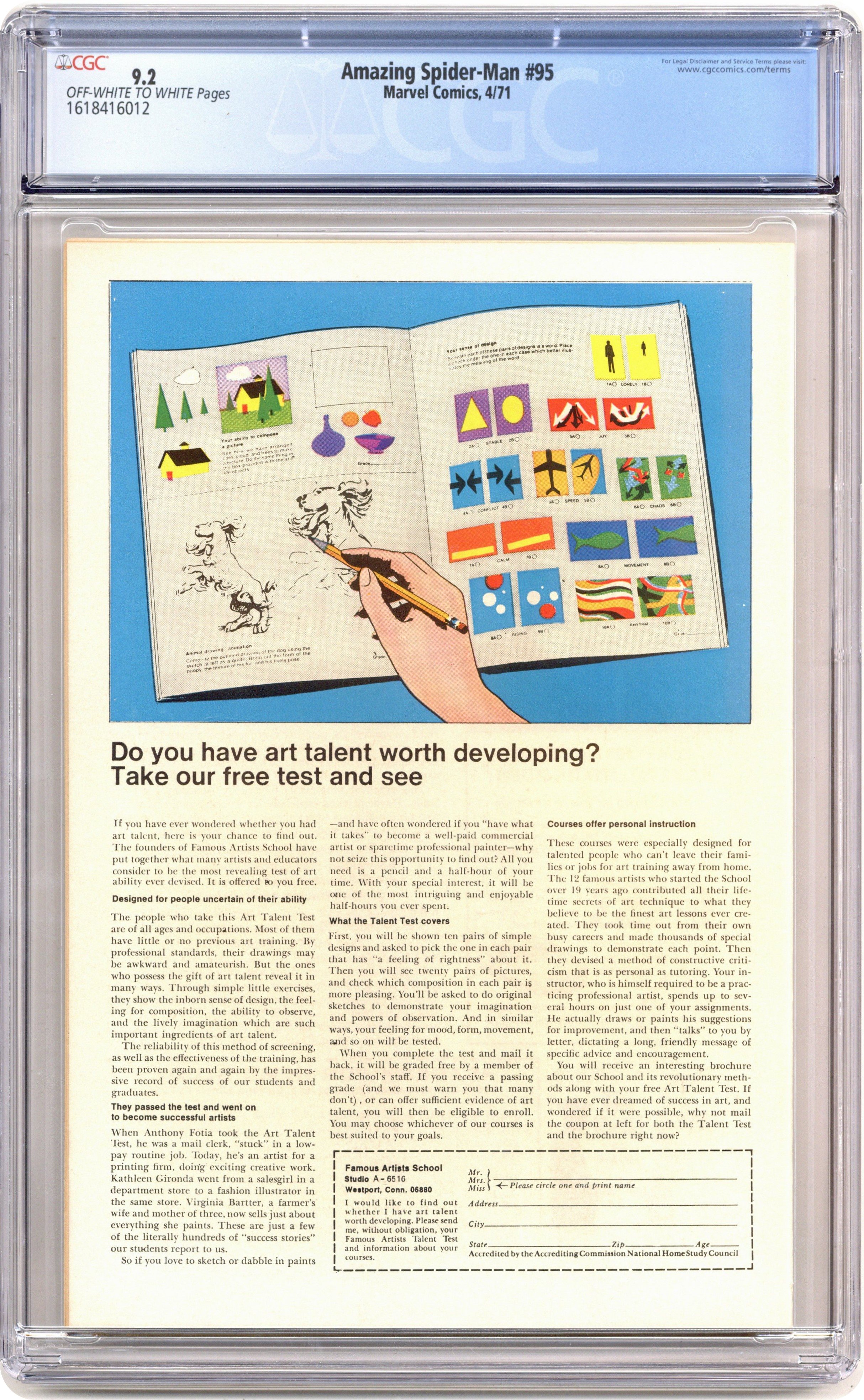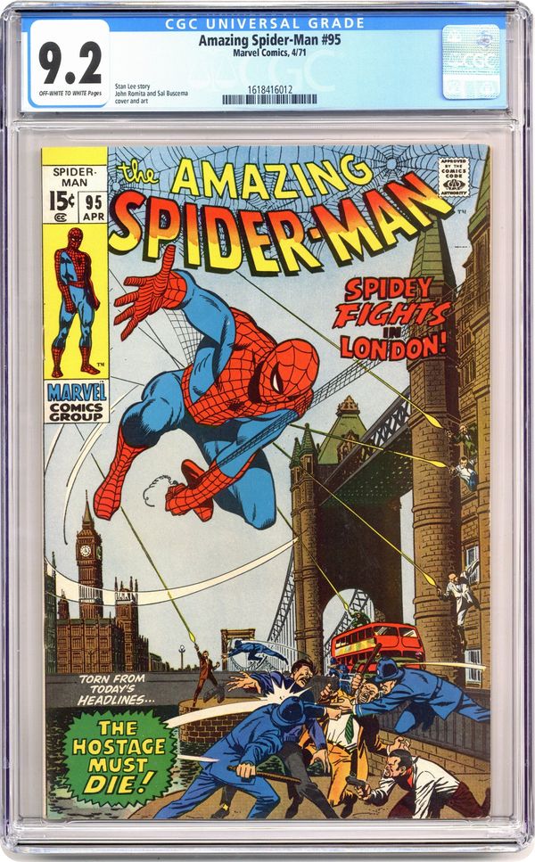"Trap for a Terrorist!" Script by Stan Lee. Pencils by John Romita. Inks by Sal Buscema. Cover by John Romita and Sal Buscema. As a favor to the Daily Bugle's freelance photographer, Joe Robertson sends Peter Parker to England for a special assignment (and also to visit Gwen Stacy.) Aunt May's nephew is overjoyed about his business trip and quickly hops on an airplane bound for London. However also on the flight is a high-ranking American diplomat -- who is abducted by terrorists once the place lands at Heathrow Airport! Fortunately, Peter brought his familiar red and blue suit across the pond! And the Amazing Spider-Man swings into action from the Tower Bridge to the Big Ben Clock -- to save the American delegate! But will the web-slinger's much-publicized appearance in London derail Peter's plan to visit Gwen? Cameo appearances by J. Jonah Jameson, Aunt May, Anna Watson, Mary Jane Watson, Harry Osborn, Arthur Stacy, and Nancy Stacy. (Notes: This story was reprinted in Marvel Tales #76. The letters page includes a statement of ownership: average print run 596,102; average paid circulation 322,195.) 36 pages. Cover price $0.15. Grade: CGC 9.2 explanation of grade Condition: Used (collectible)