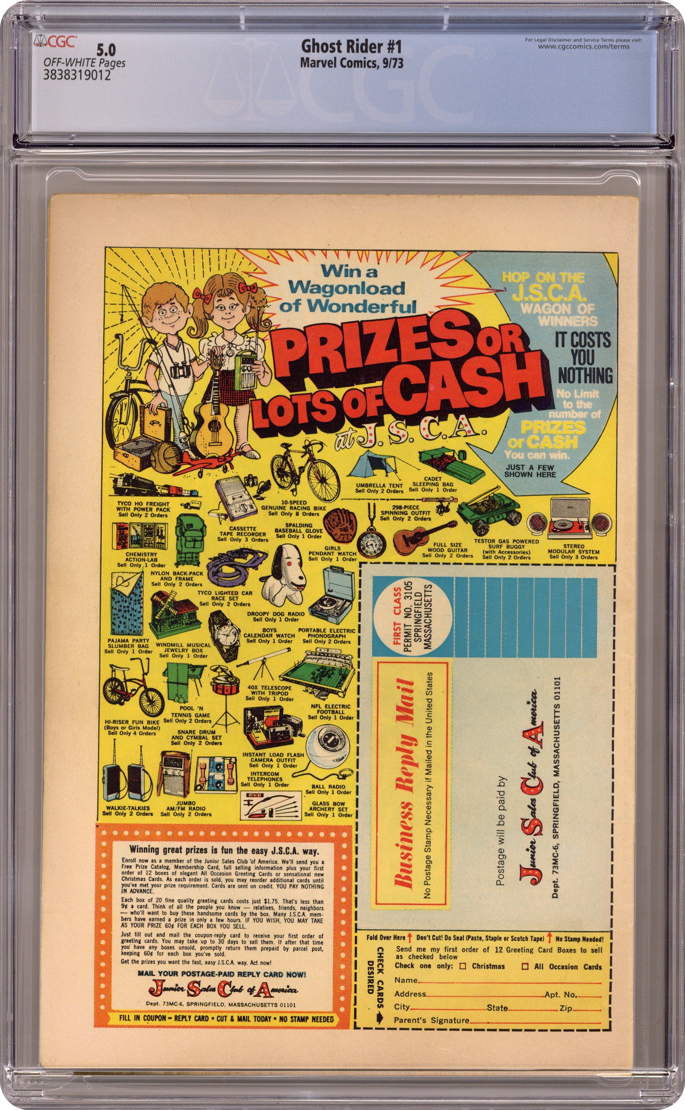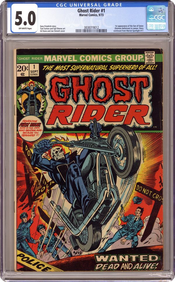 "A Woman Possessed!" Guest-starring Daimon Hellstrom (Son of Satan). Story by Gary Friedrich. Art by Tom Sutton and Syd Shores. Cover by Gil Kane. This issue picks up after the events in Marvel Spotlight (1971-1977 1st Series) #11. Johnny Blaze races against the clock to save a woman from a fate worse than death. Featuring the evil of Mephisto (as Satan). 32 pages, FC. NOTE: 1st appearance of Daimon Hellstrom (Son of Satan). Cover price $0.20. Grade: CGC 5.0 explanation of grade Condition: Used (collectible)